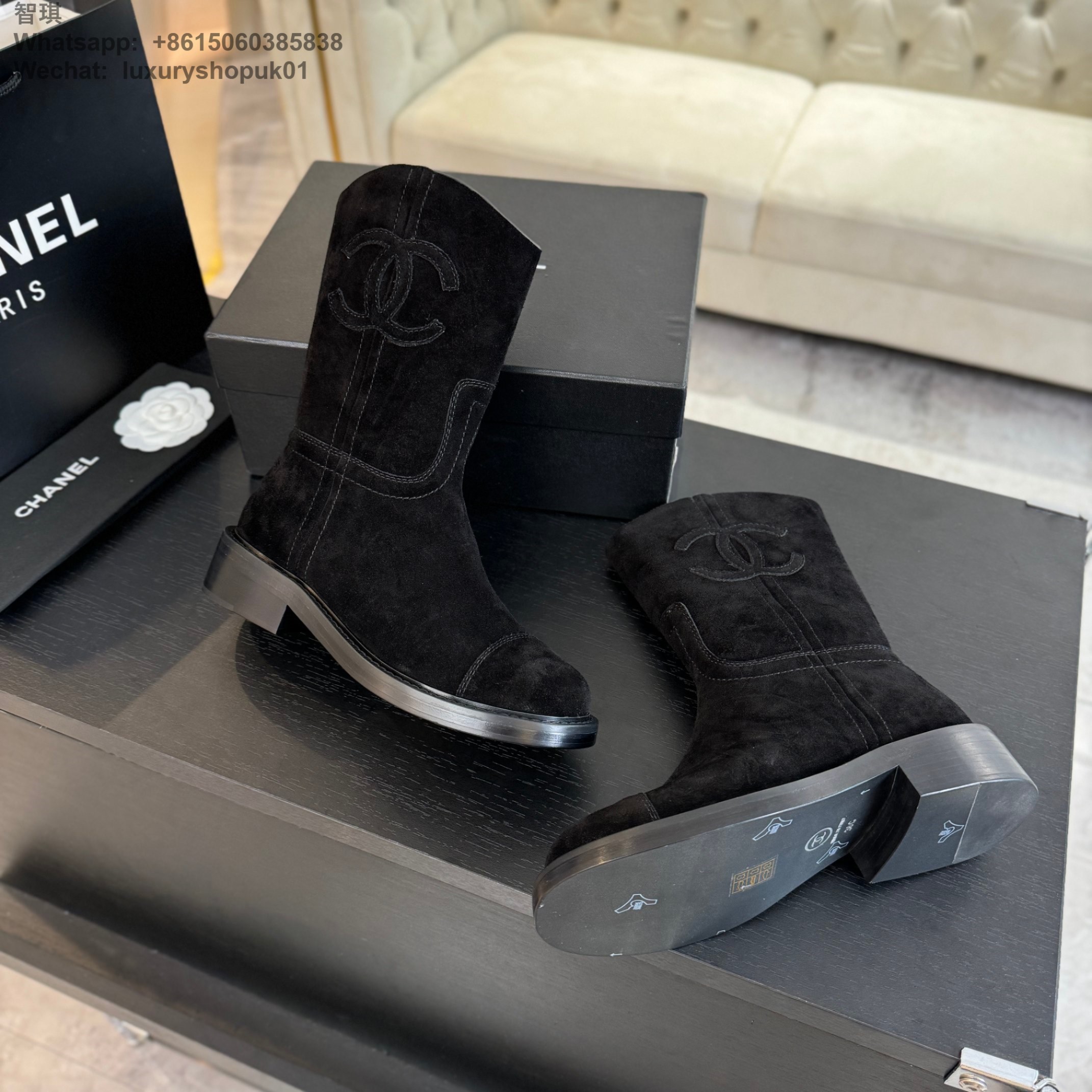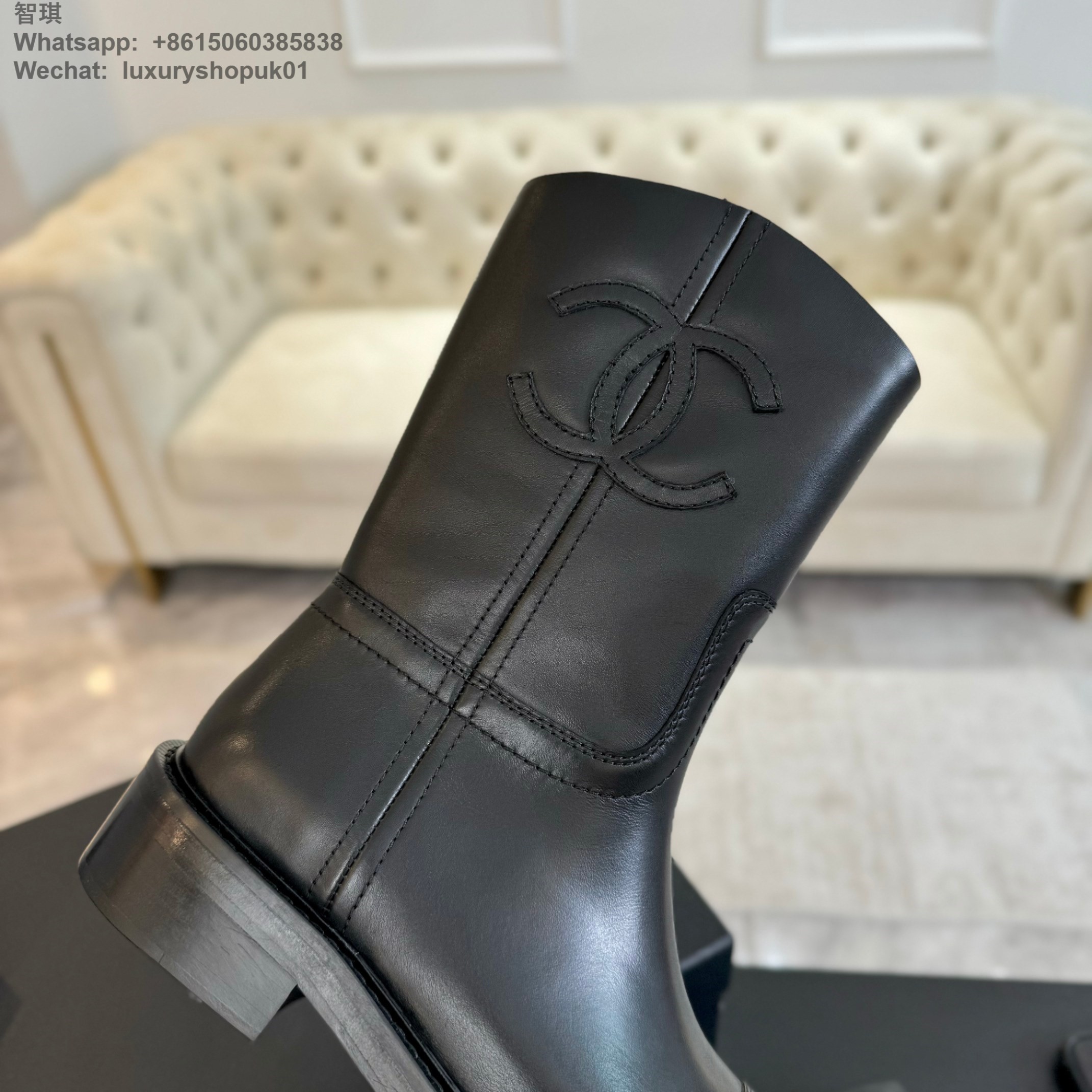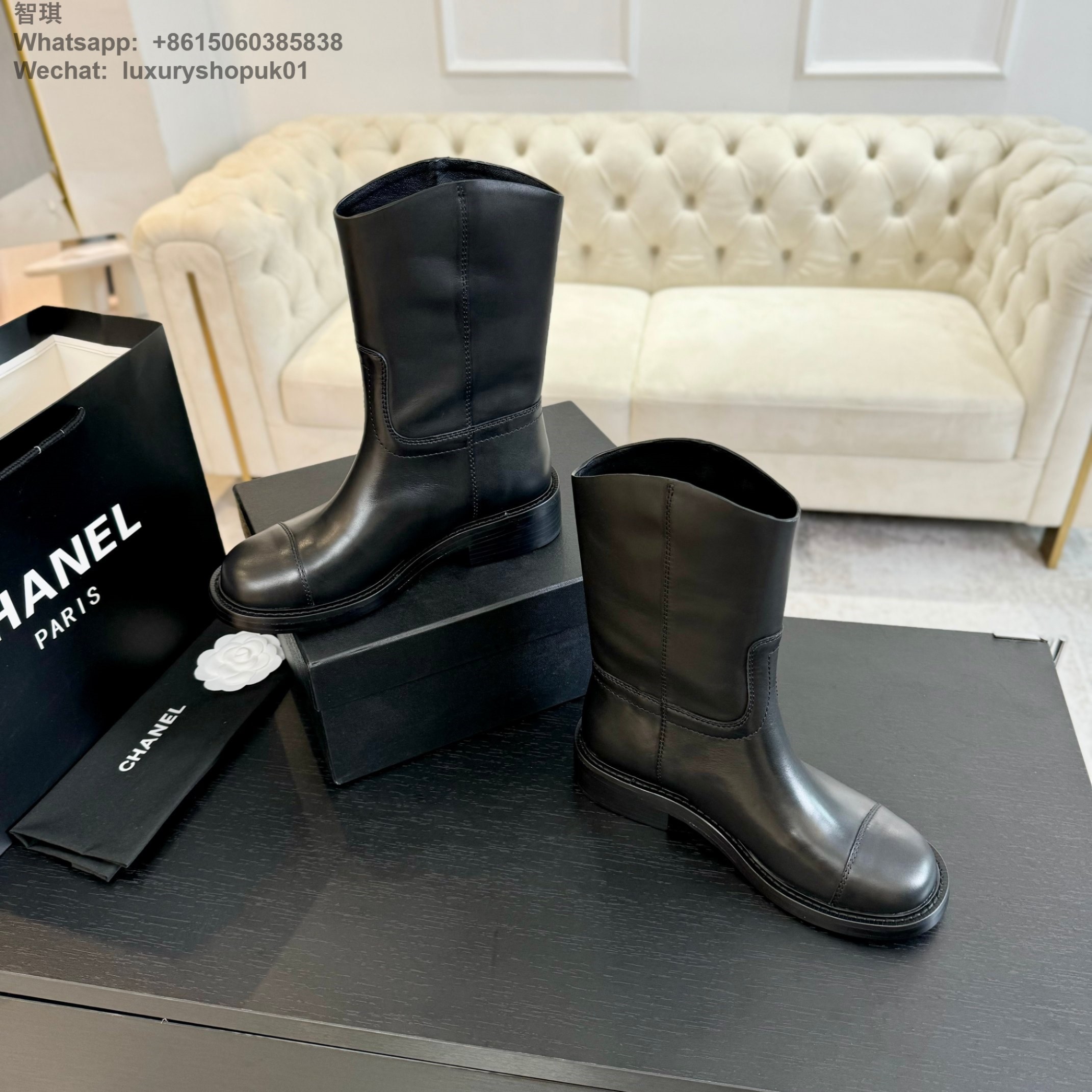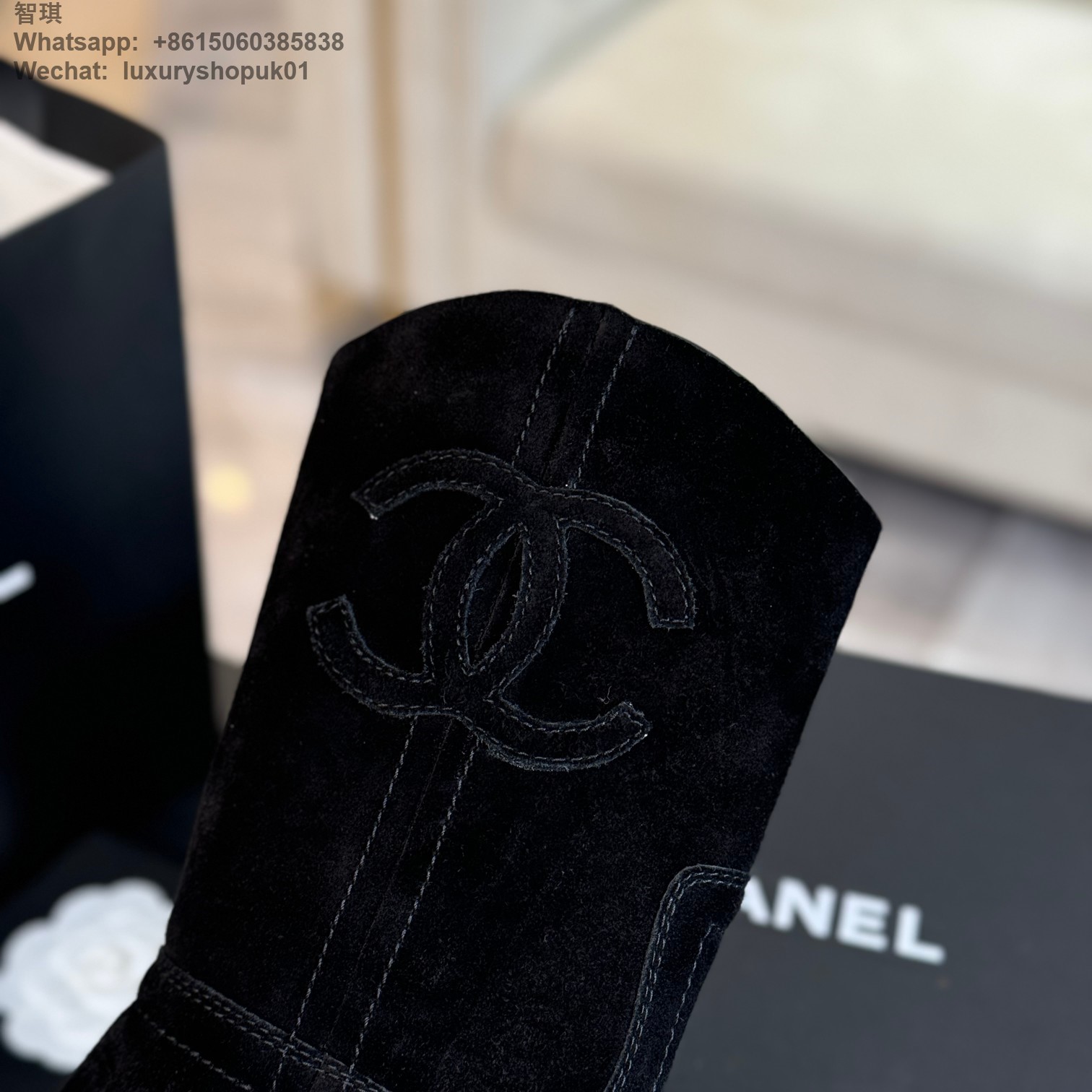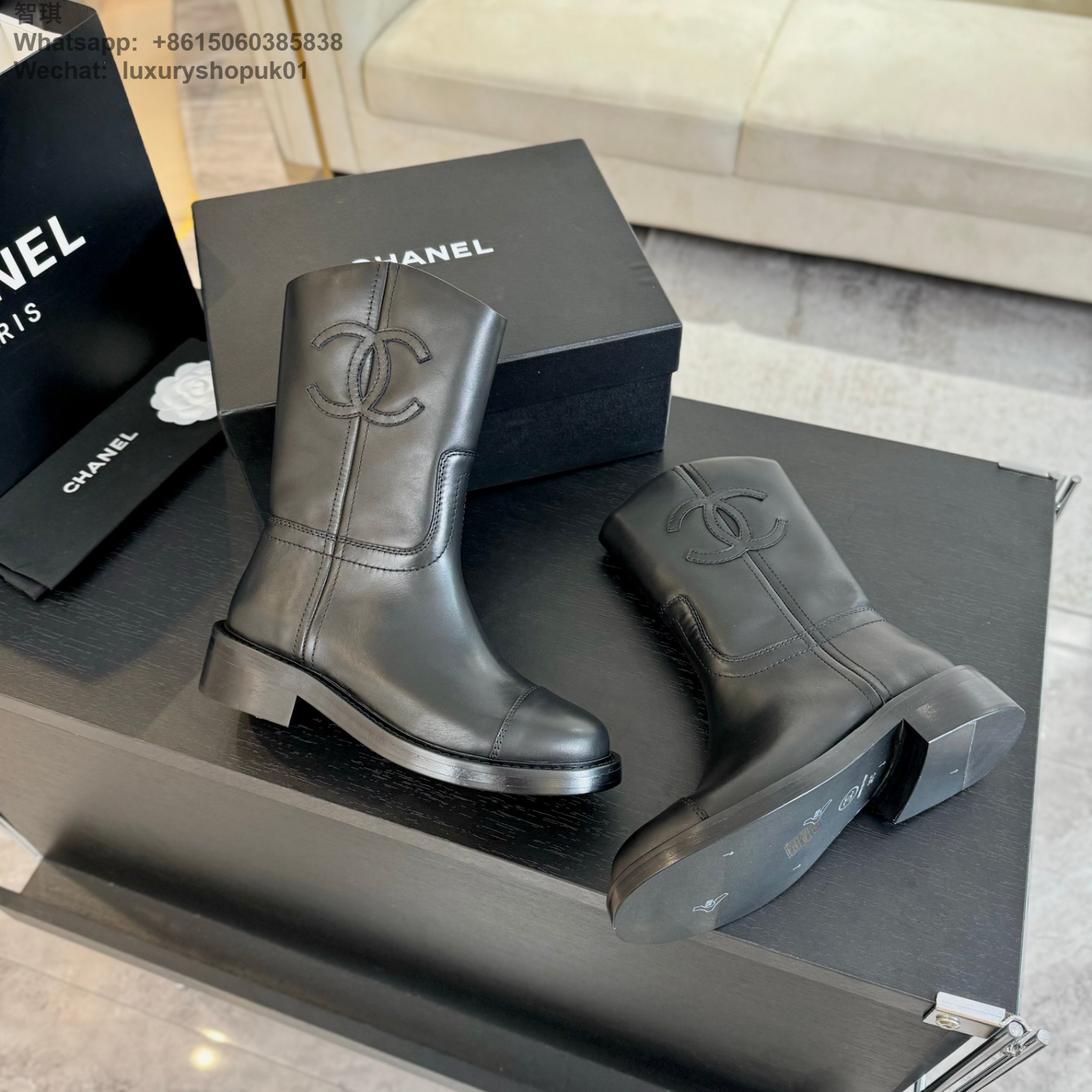 Women Chanel Knee High Leather Platform Boot Shoes black