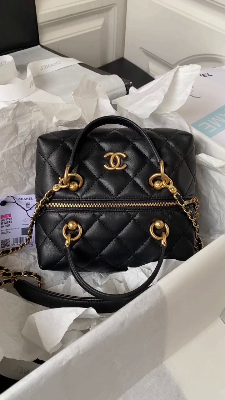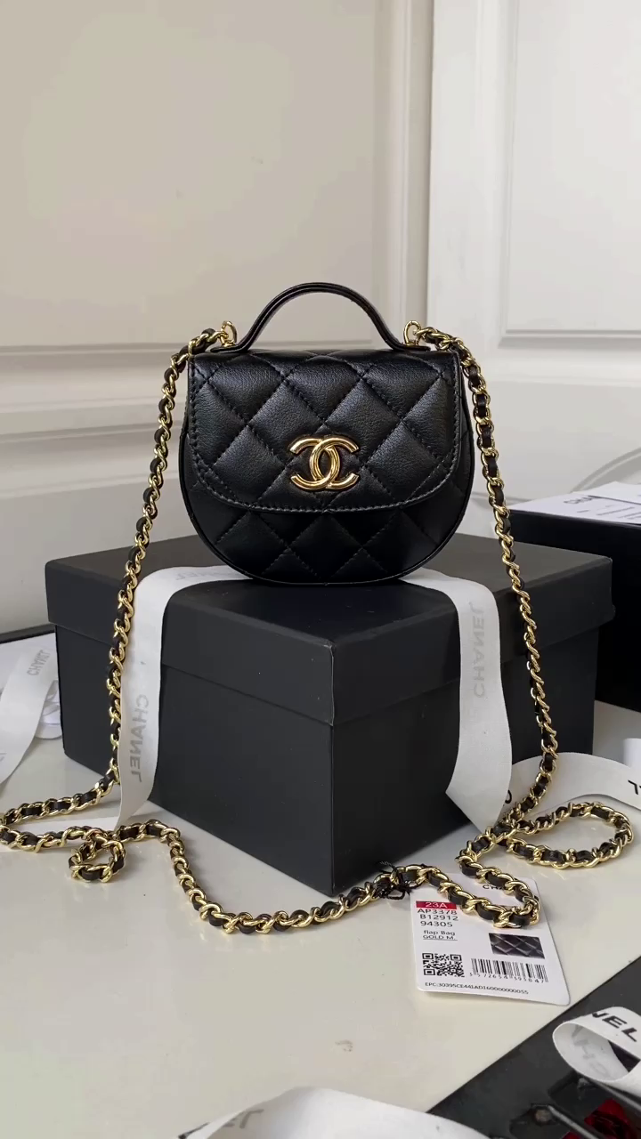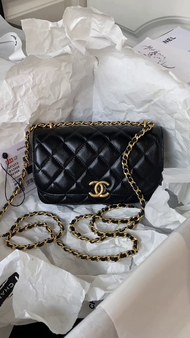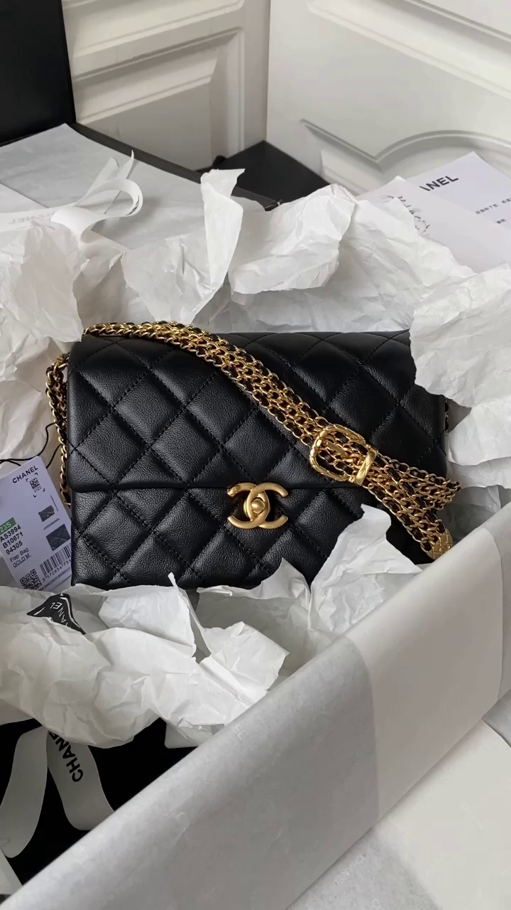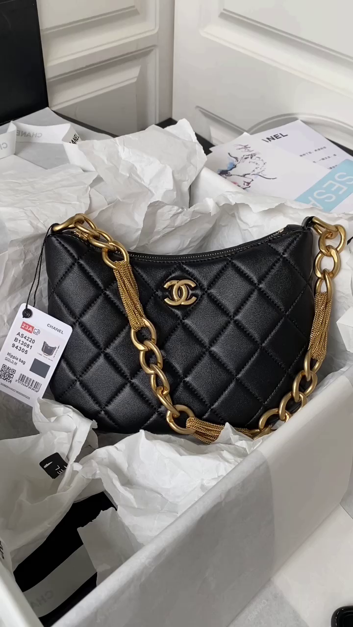 Chanel 23A Advanced Handicraft Shop Series Black Gold Leather Chain Piercing Bag AP3373, Top Quality