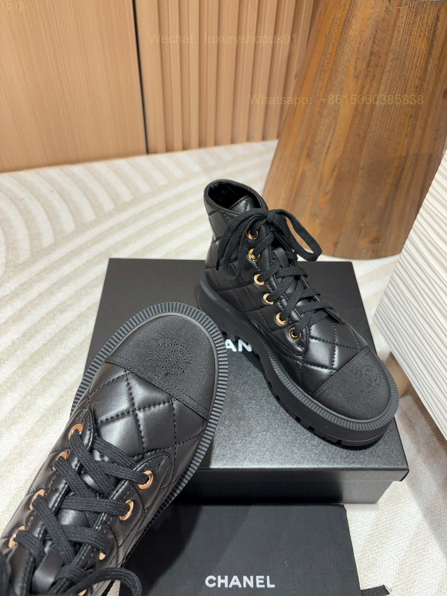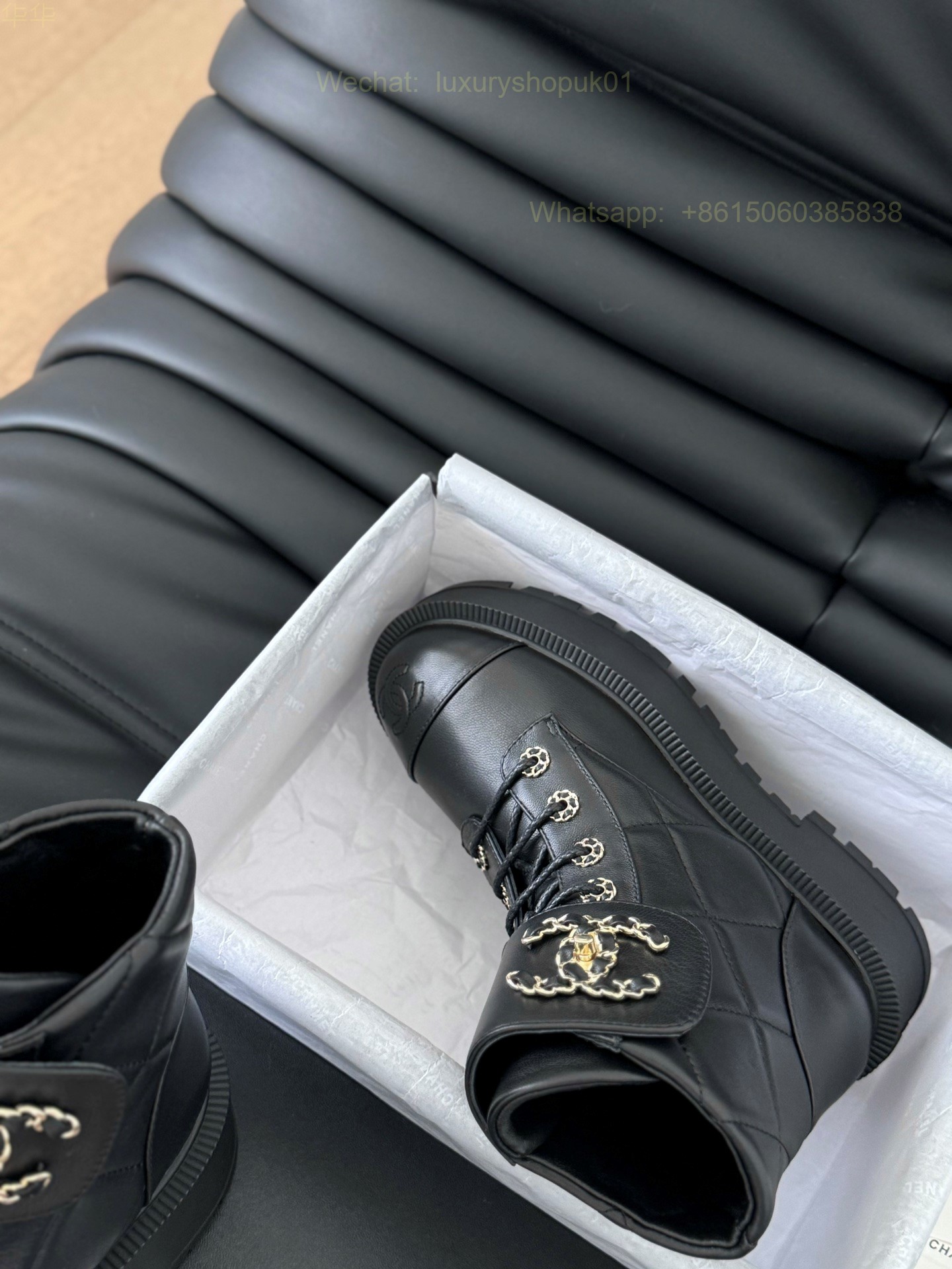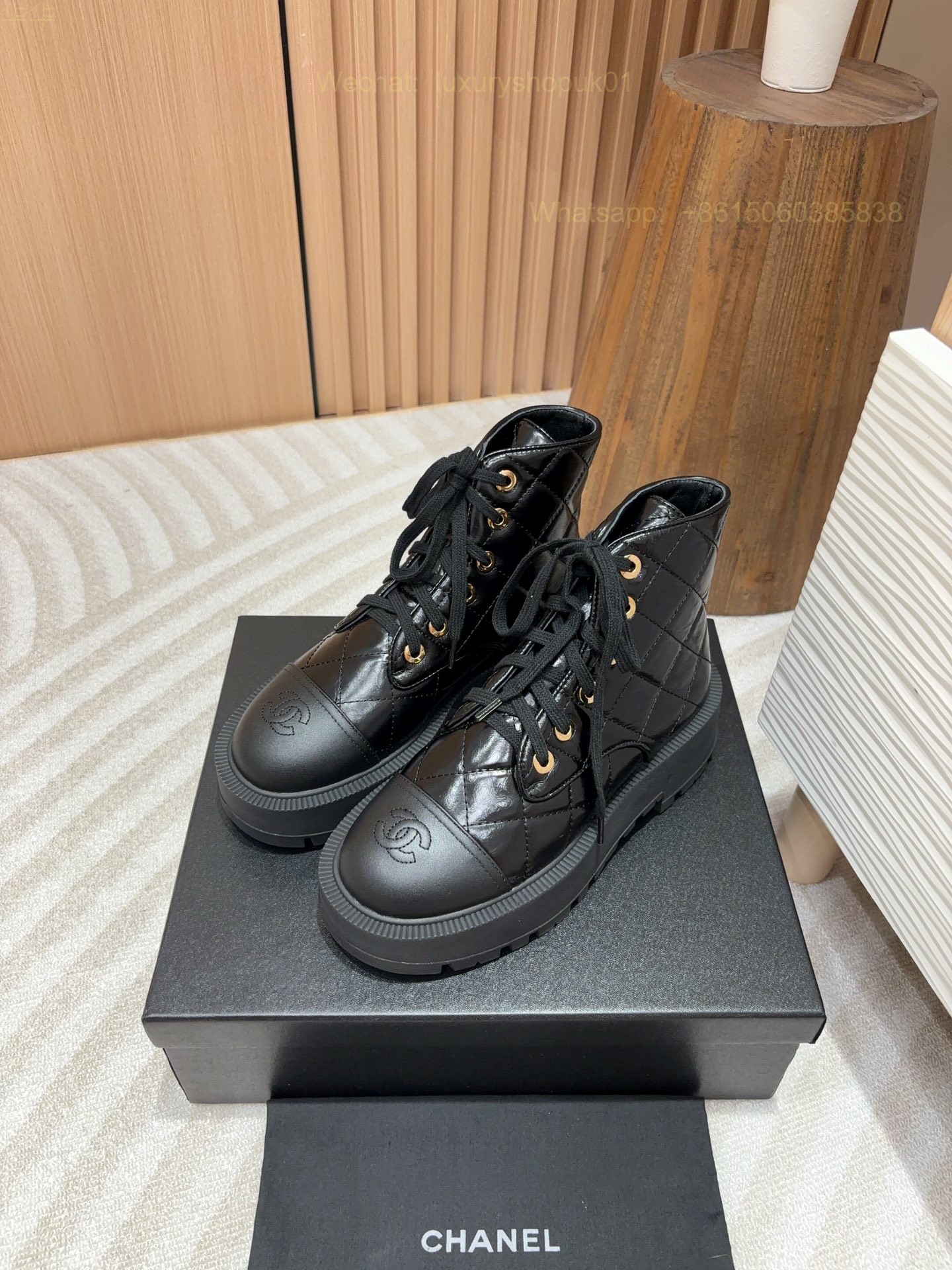 Chanel Quilted Leather CC Cap Toe Chain Link Logo Combat Boots Women Shoes