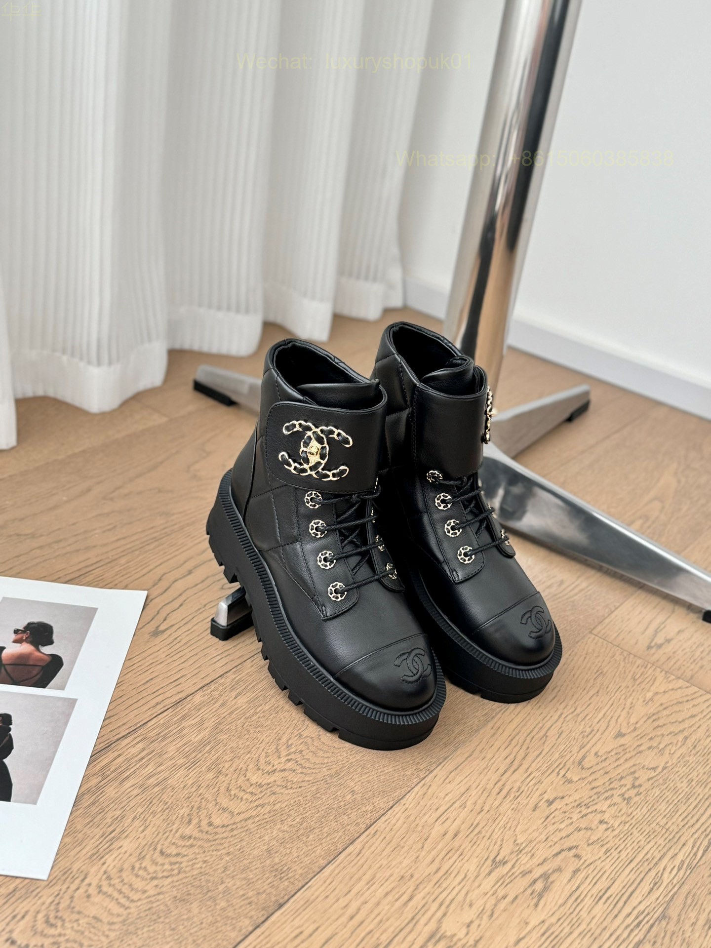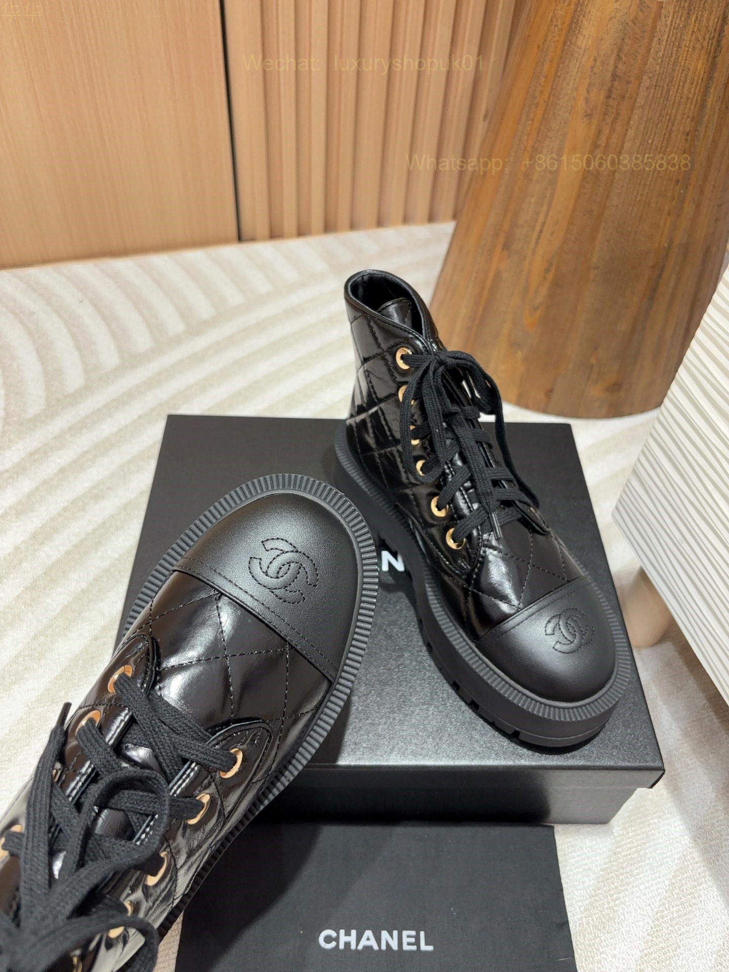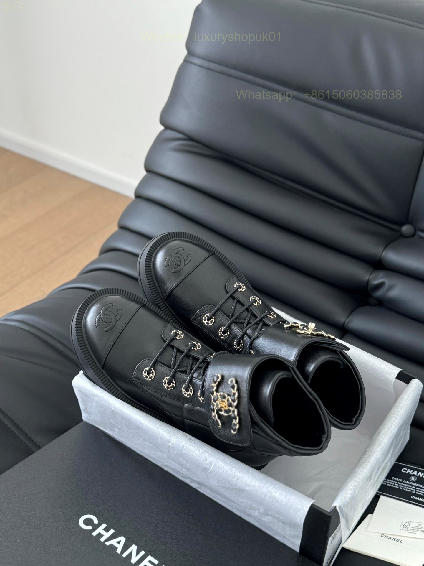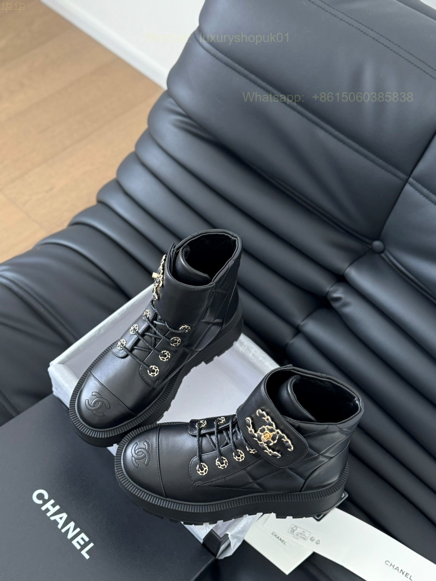 Chanel Quilted Leather CC Cap Toe Chain Link Logo Combat Boots Women Shoes