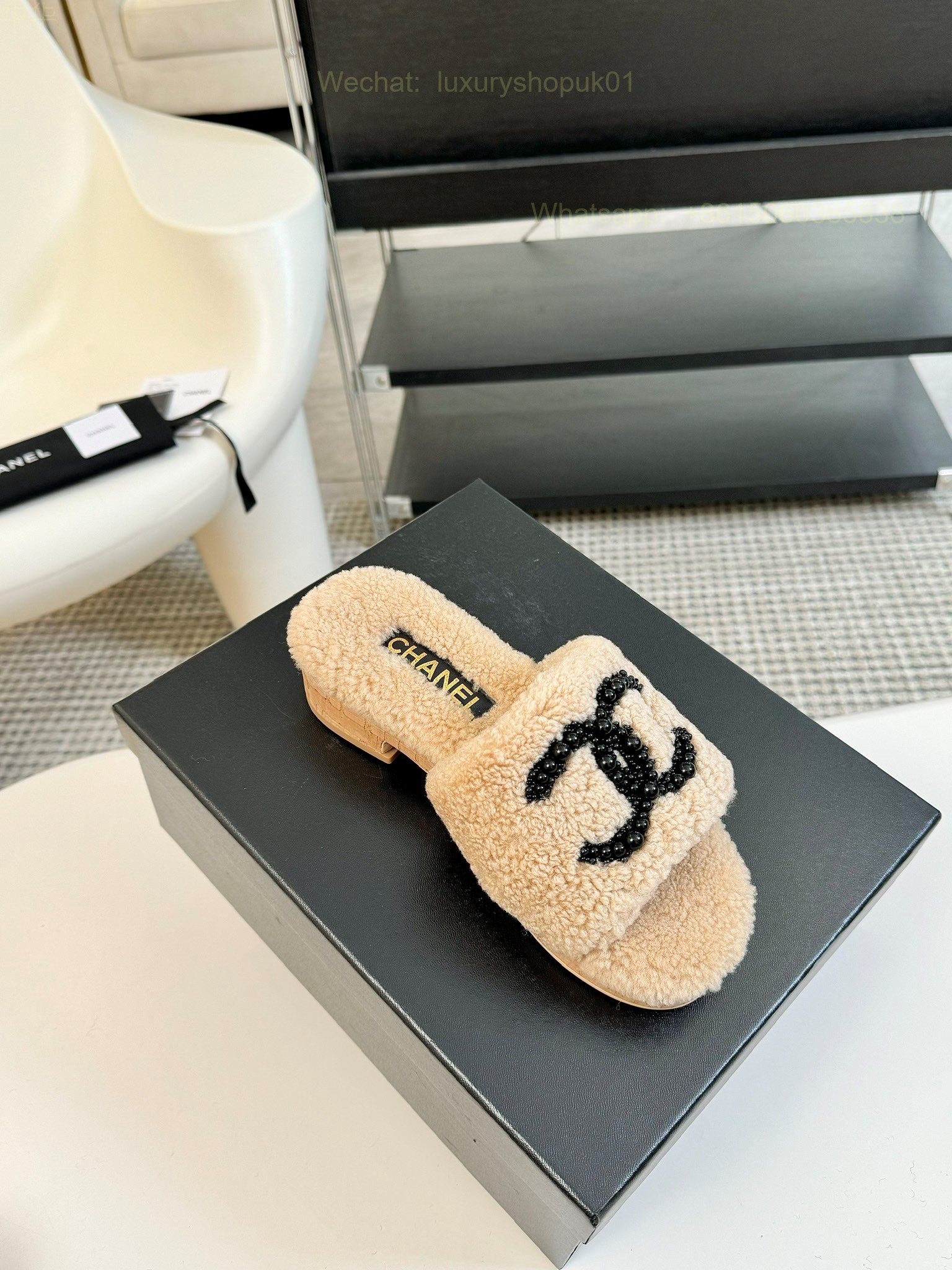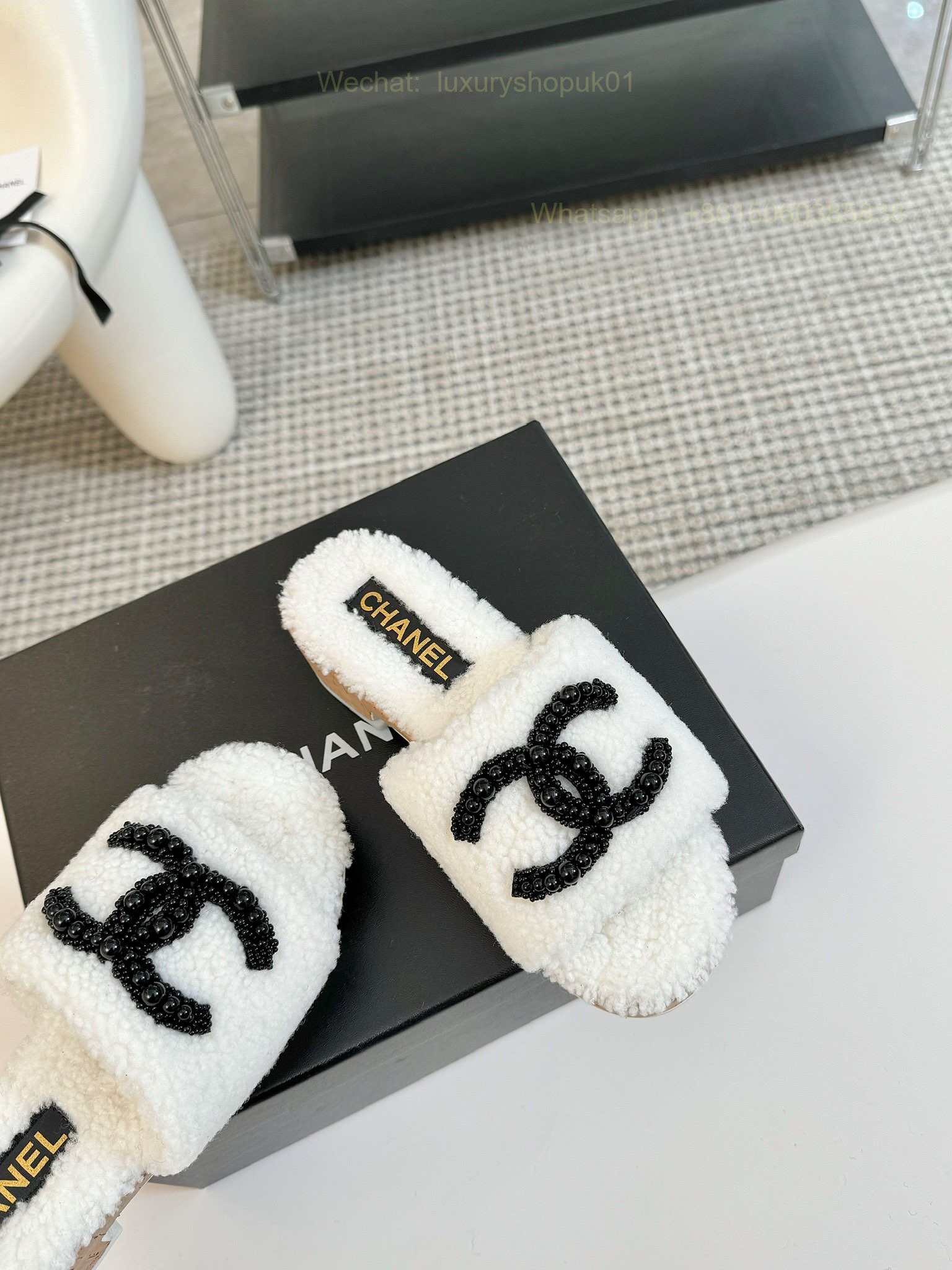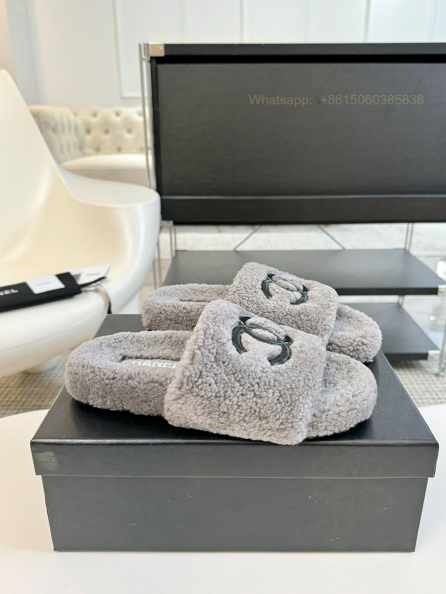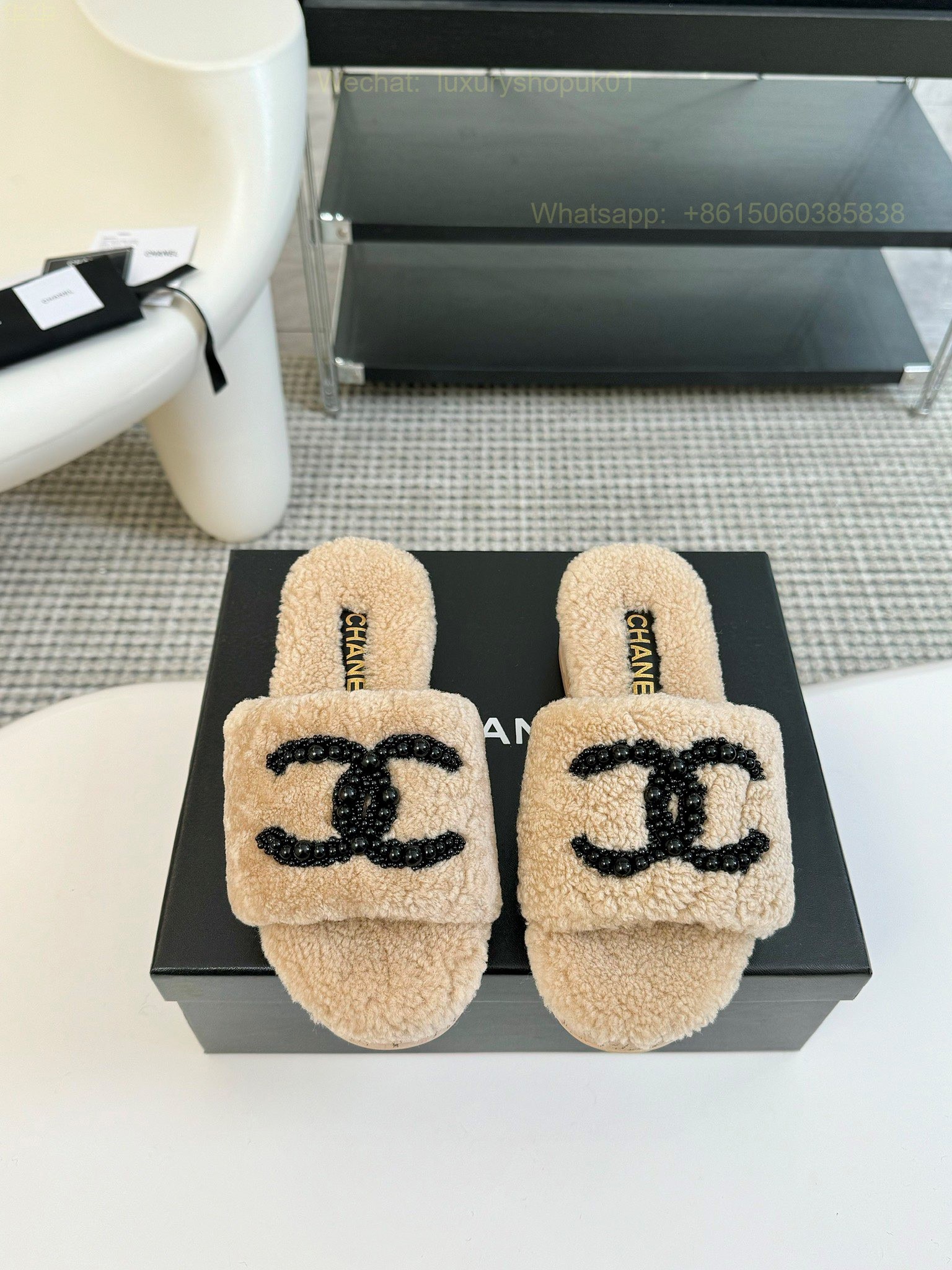 Chanel Women Faux Fur Shearling Slide Sandals Shoes
