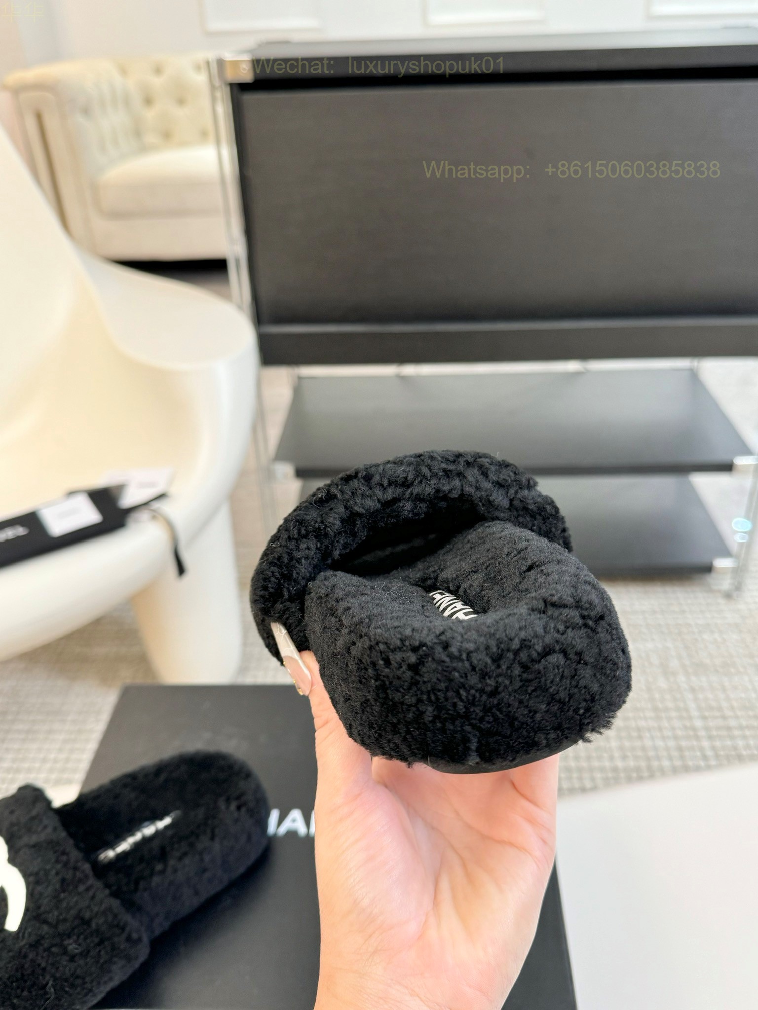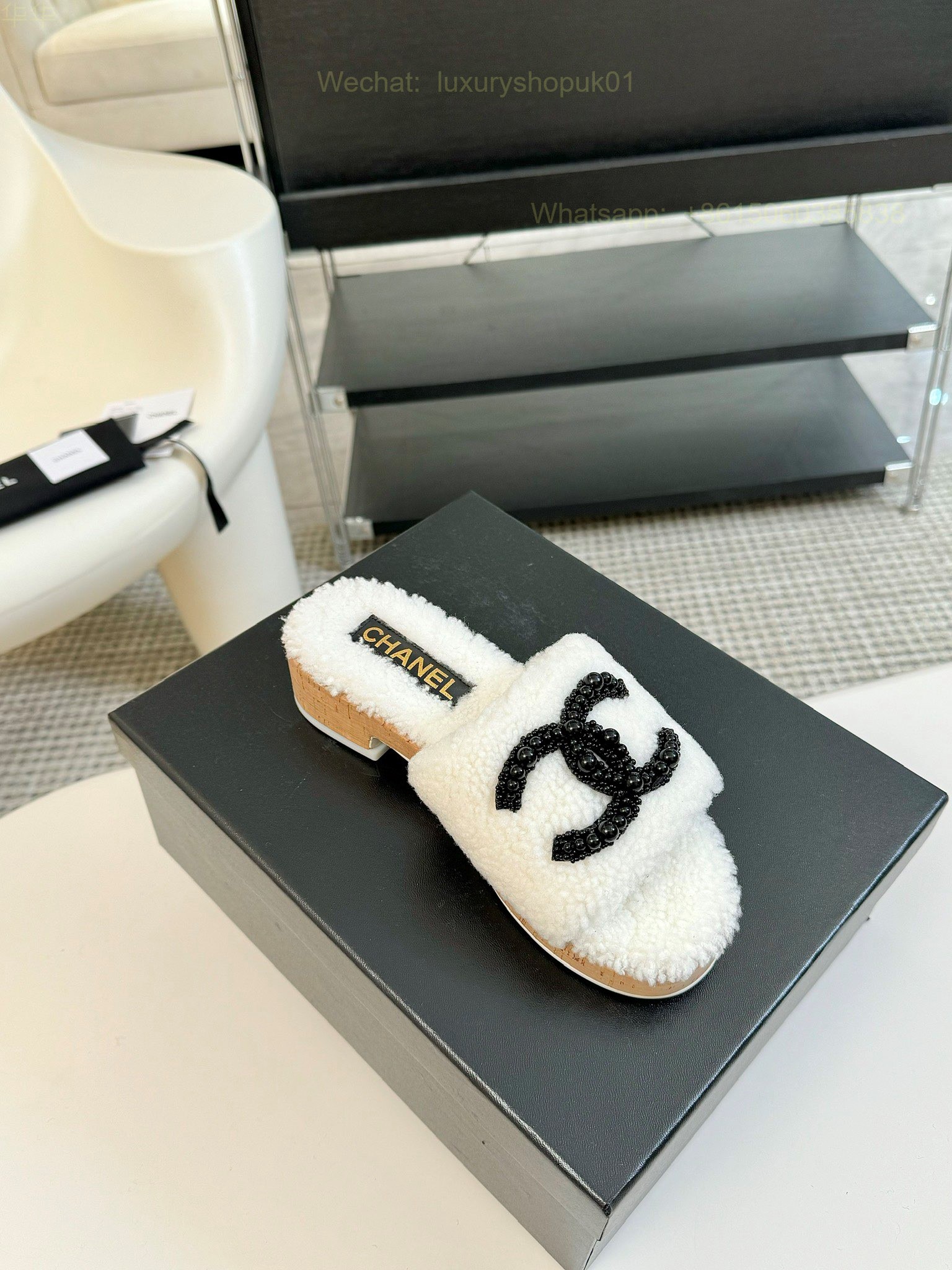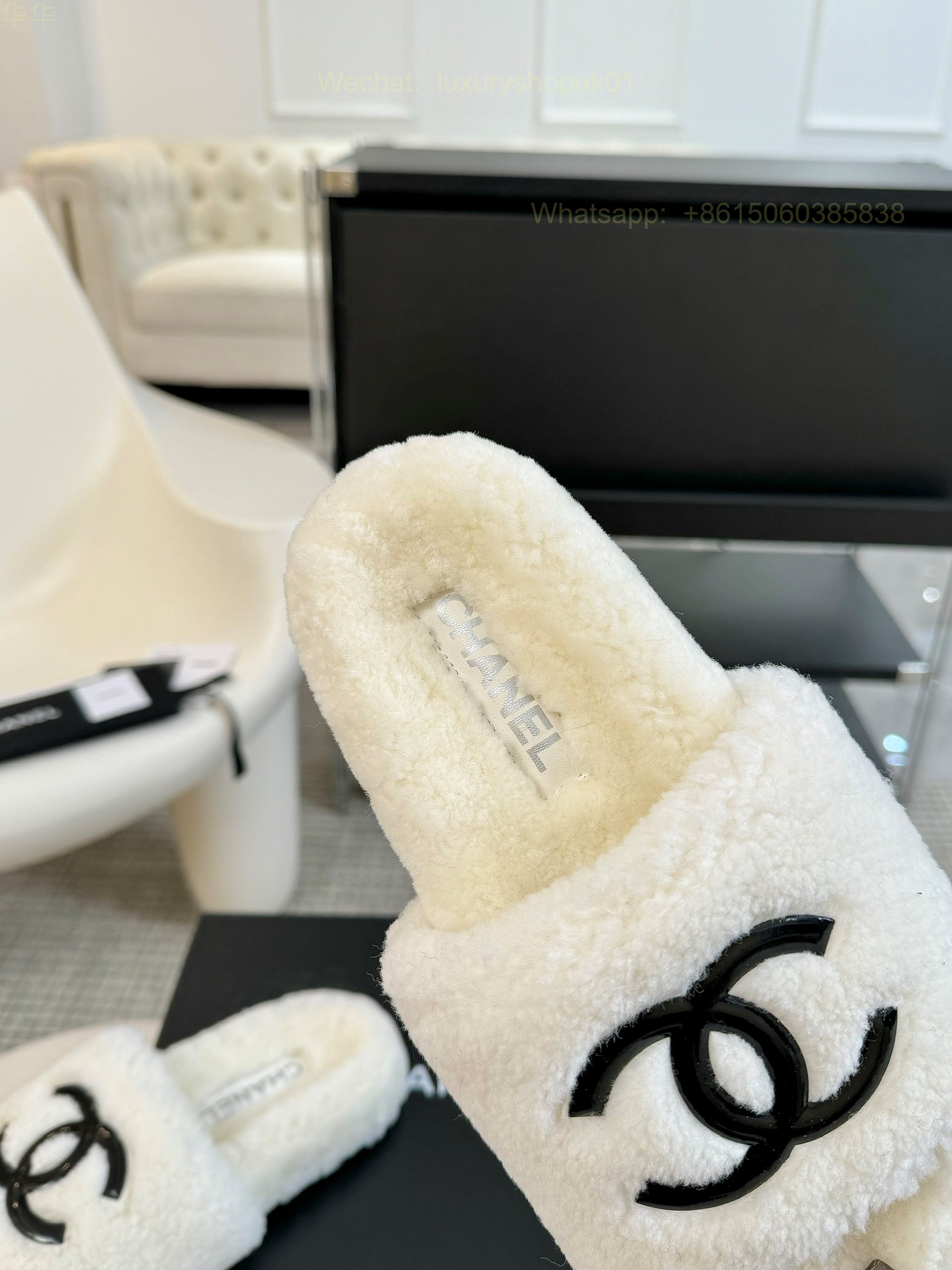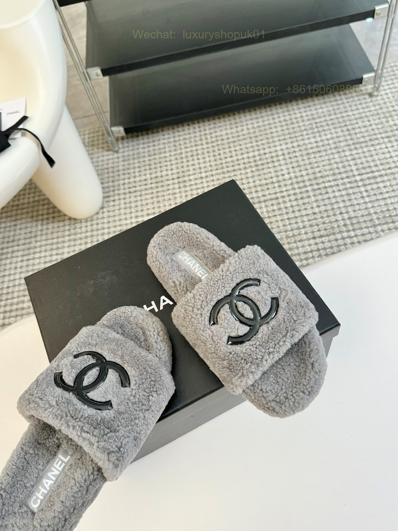 Chanel Women Faux Fur Shearling Slide Sandals Shoes