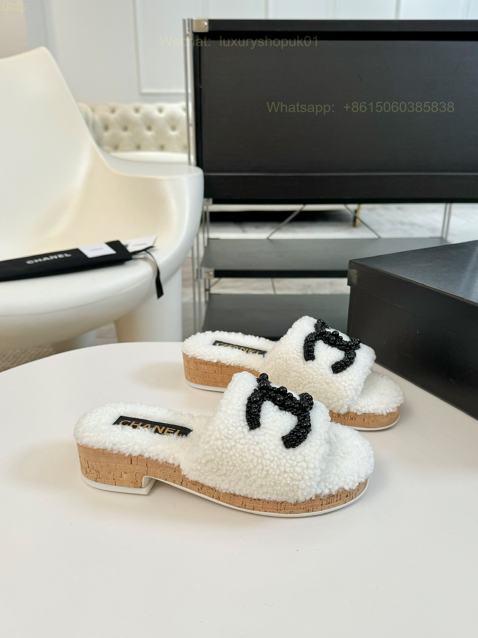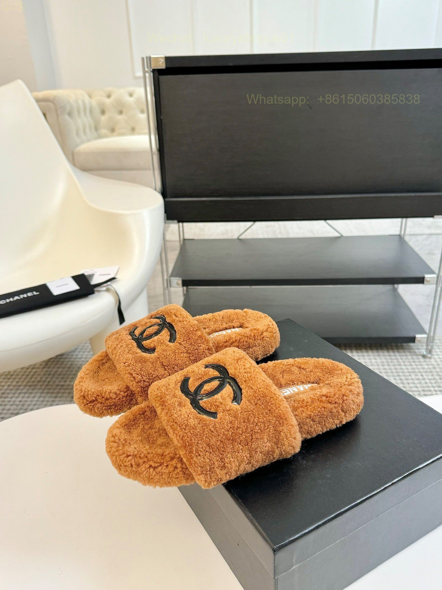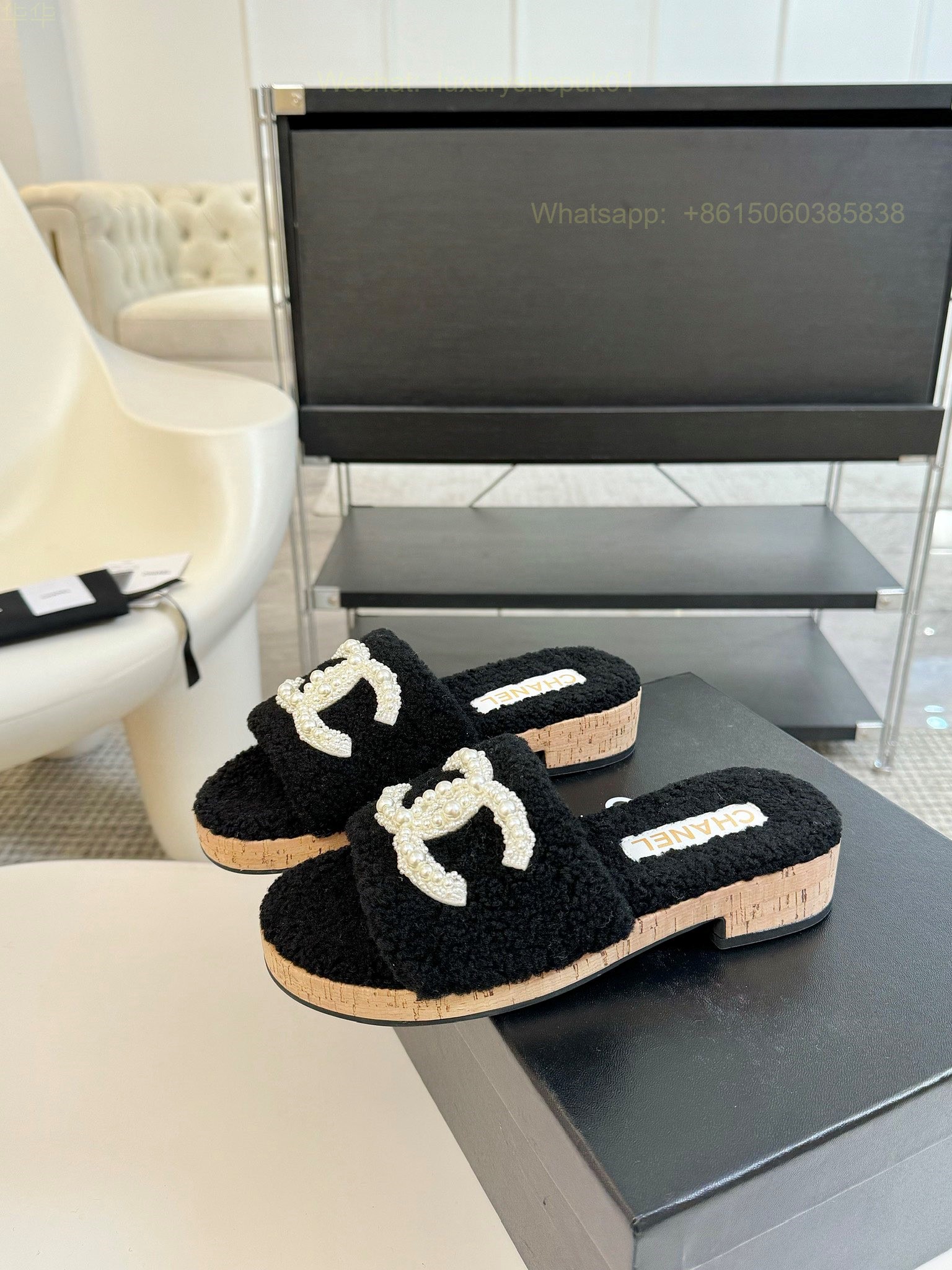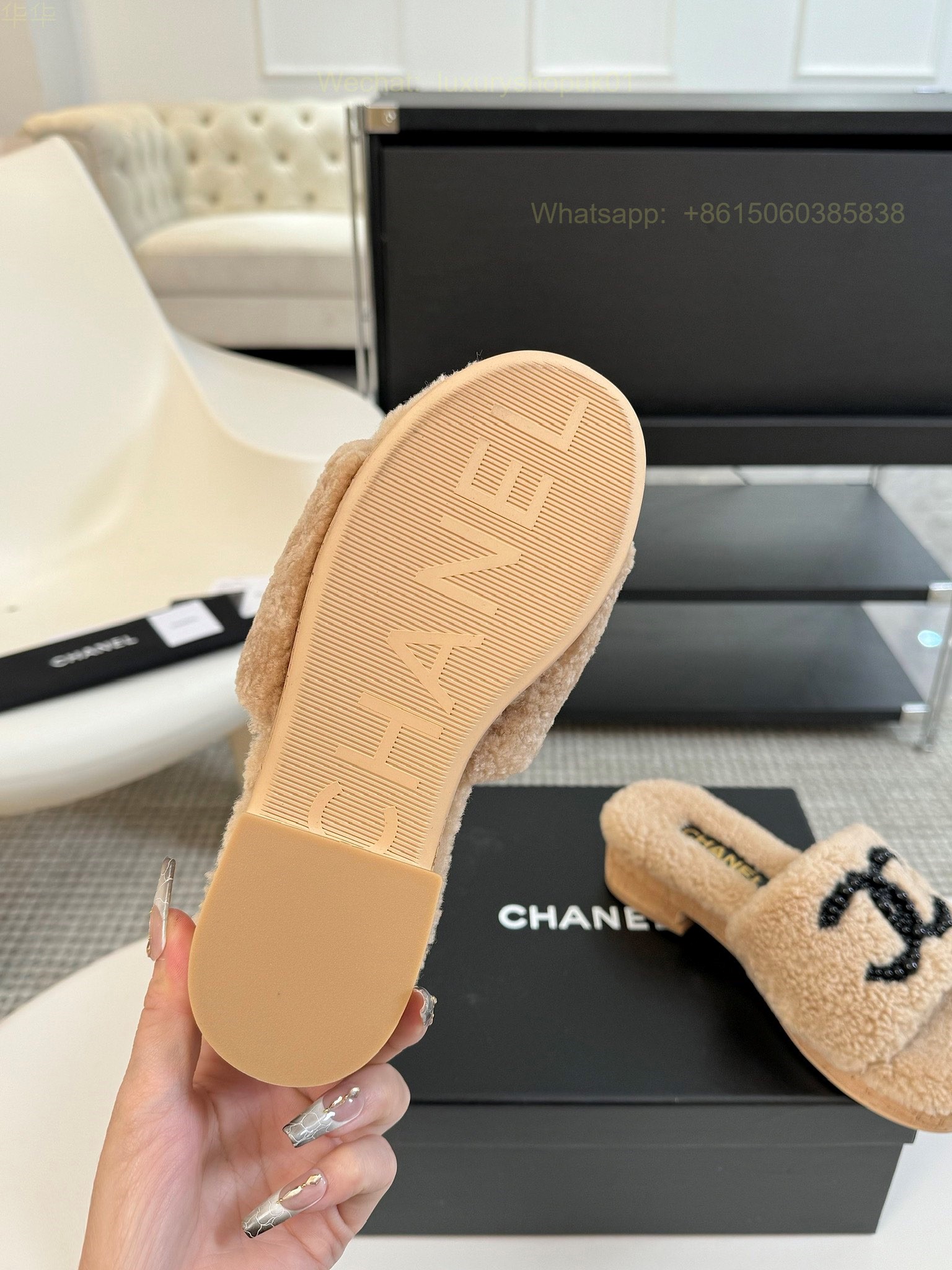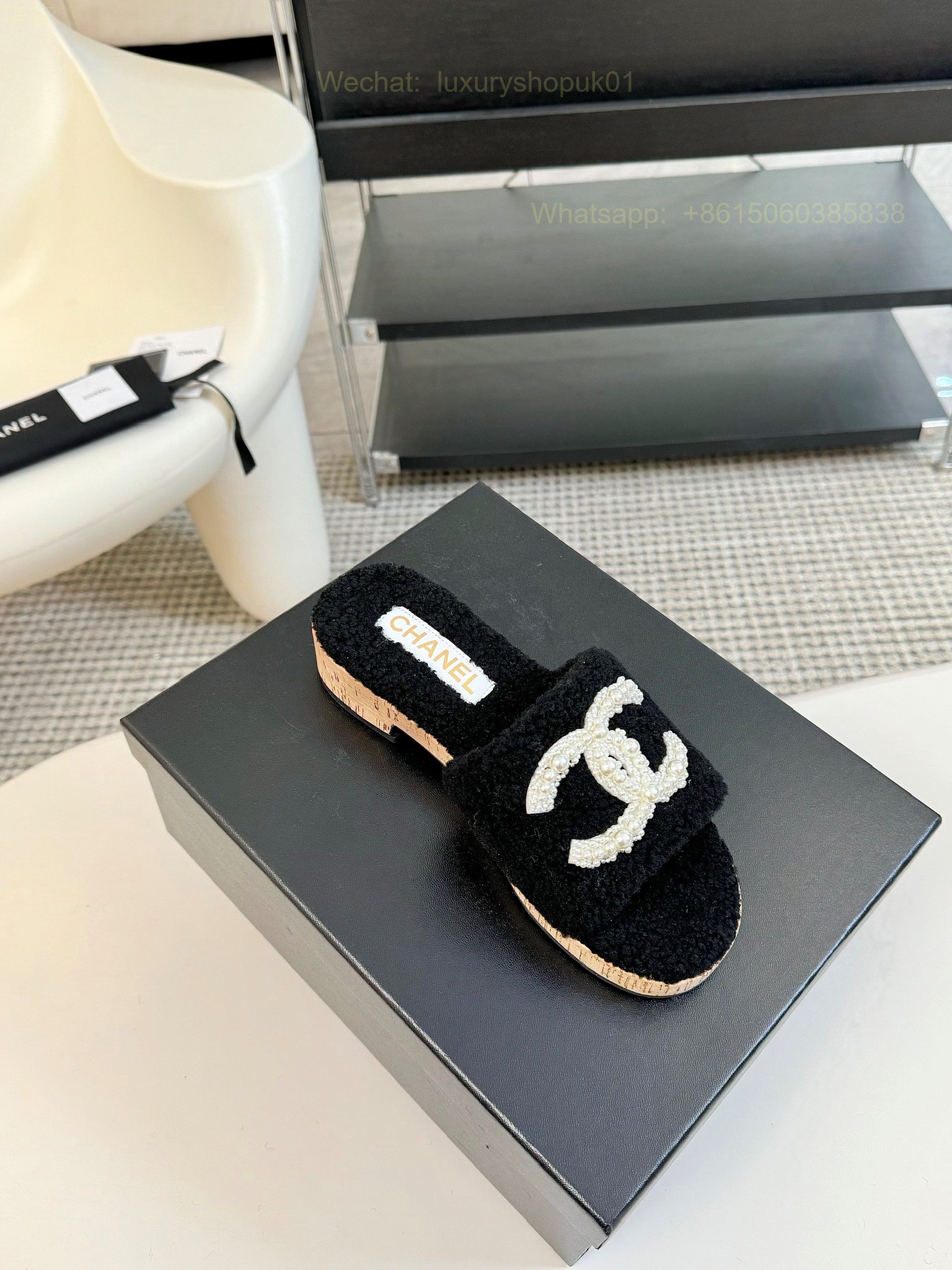 Chanel Women Faux Fur Shearling Slide Sandals Shoes