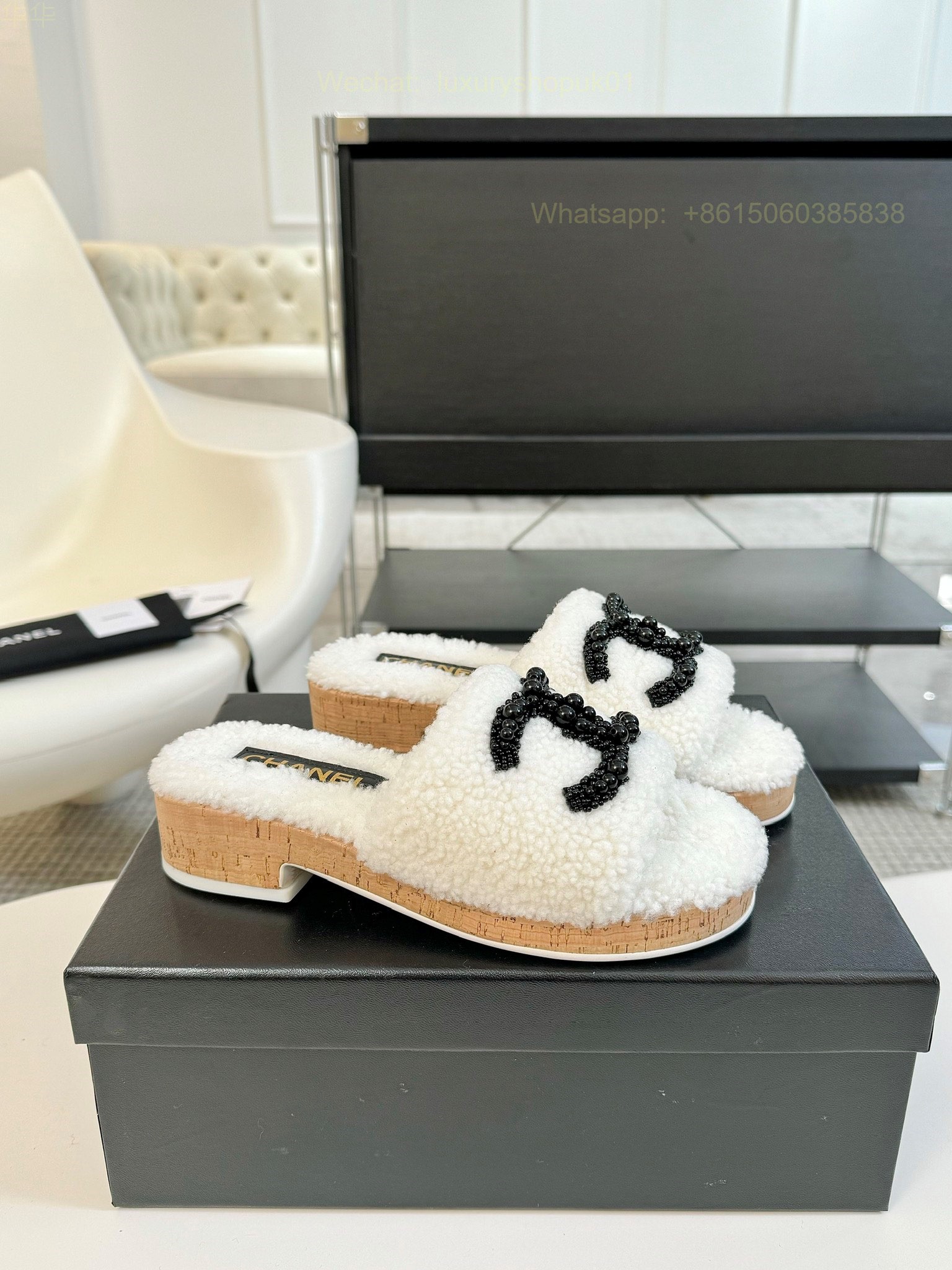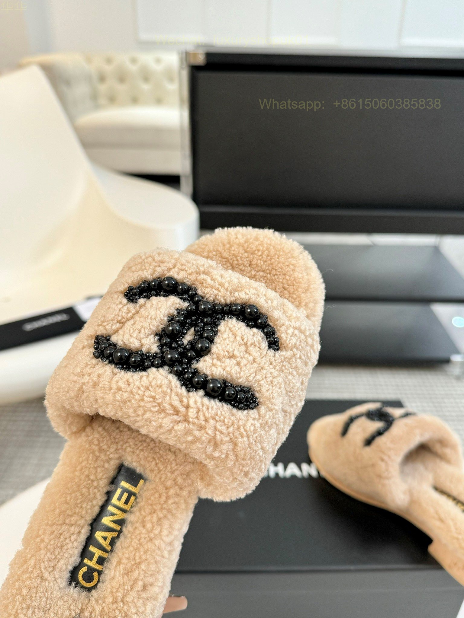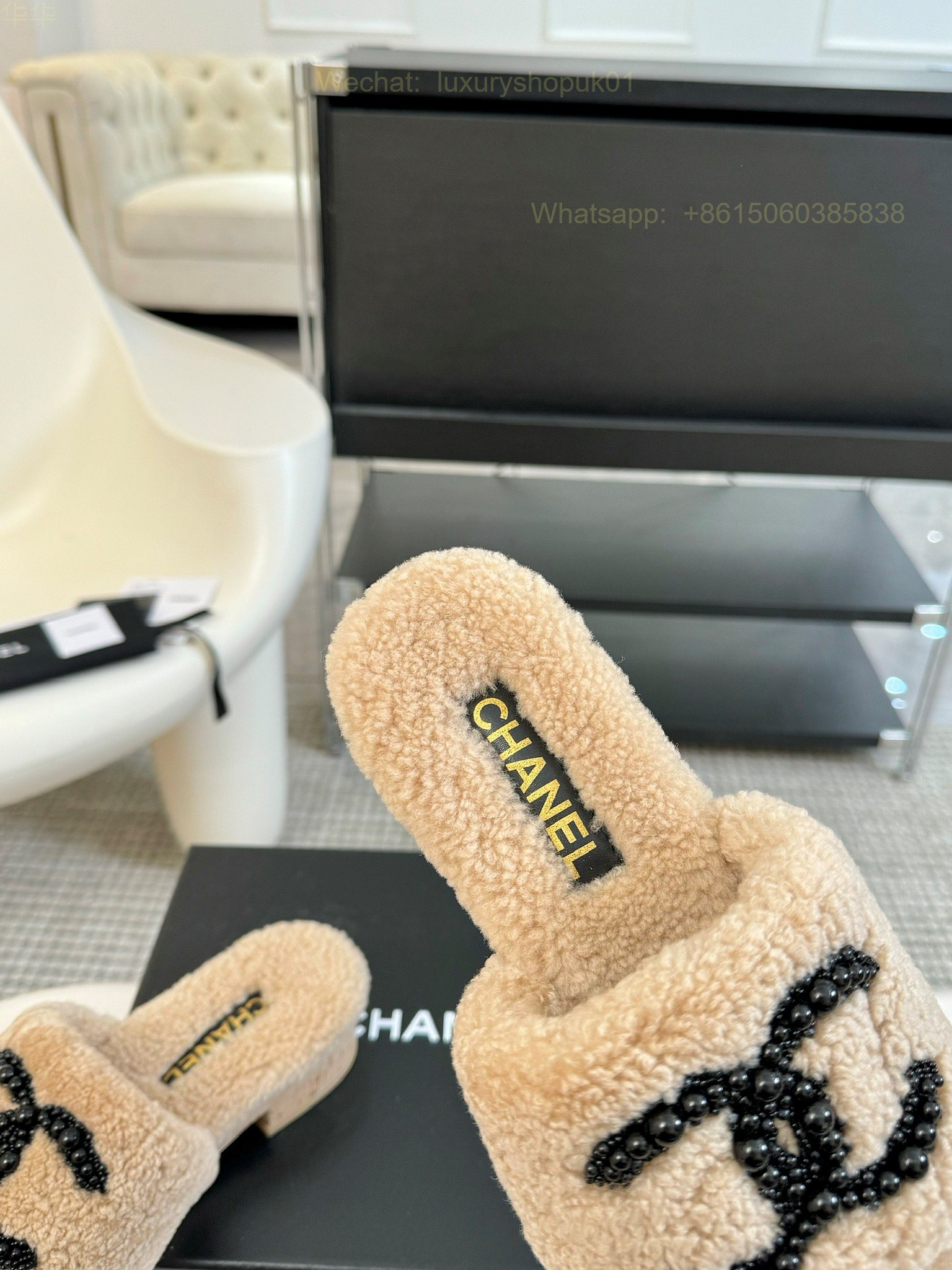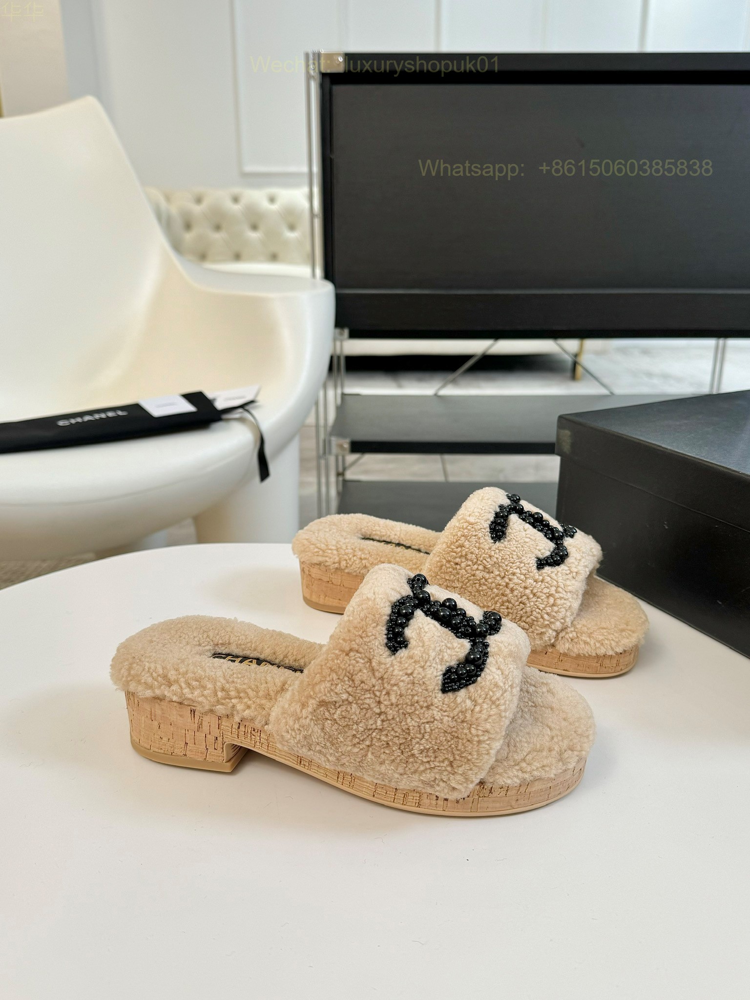 Chanel Women Faux Fur Shearling Slide Sandals Shoes