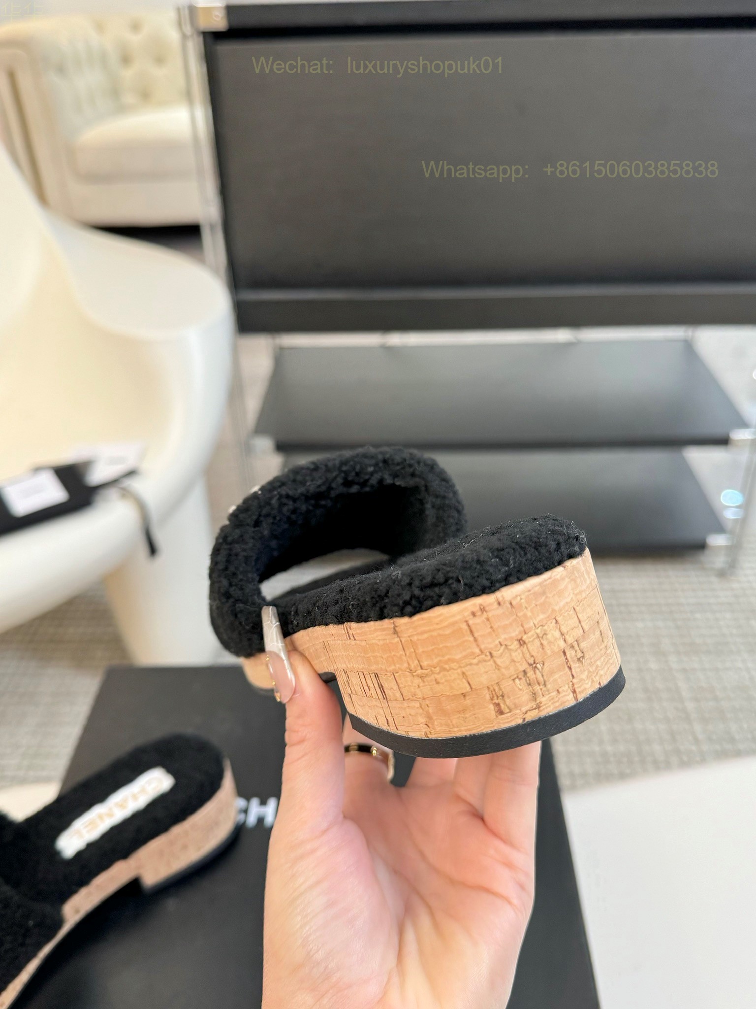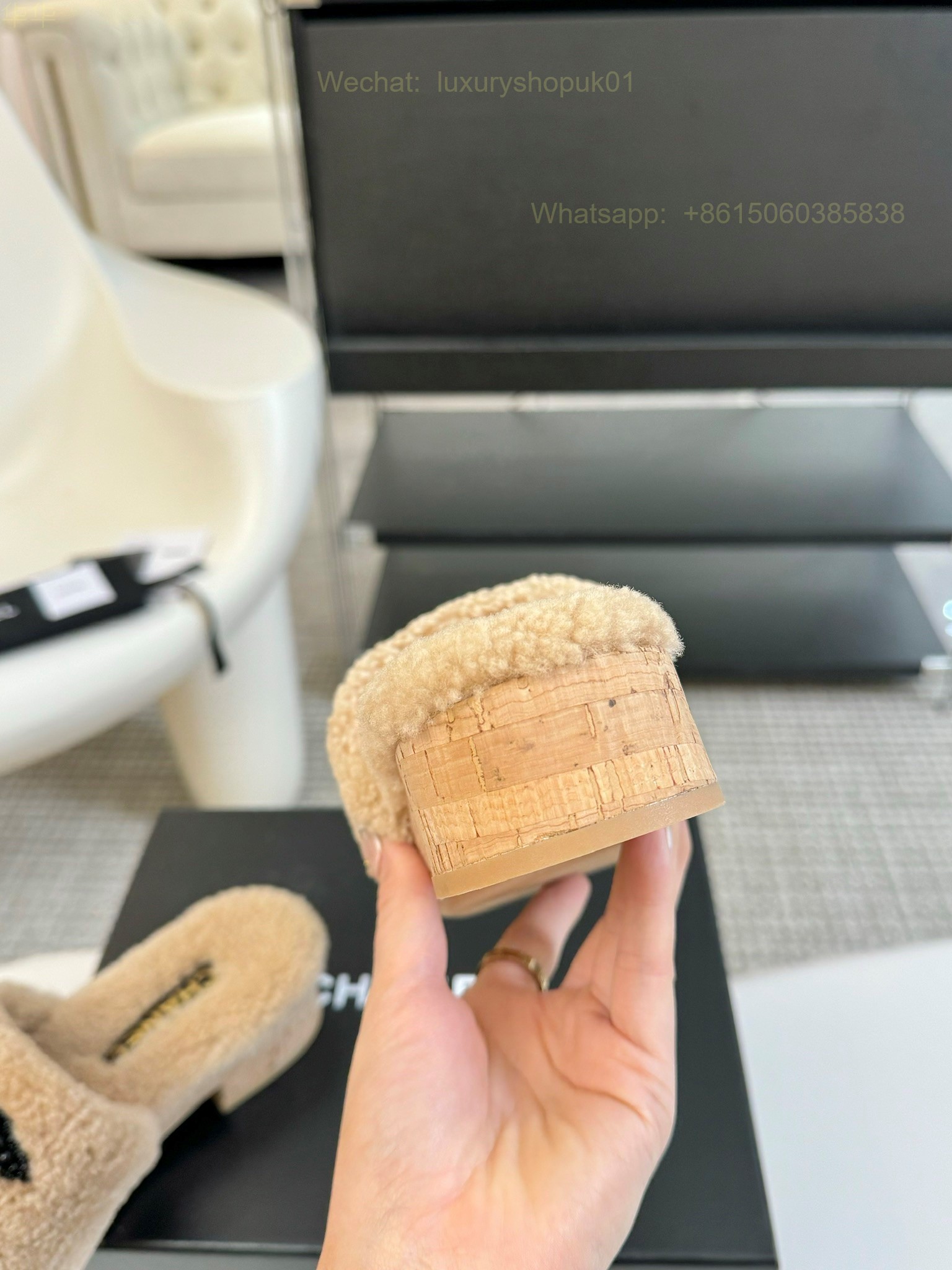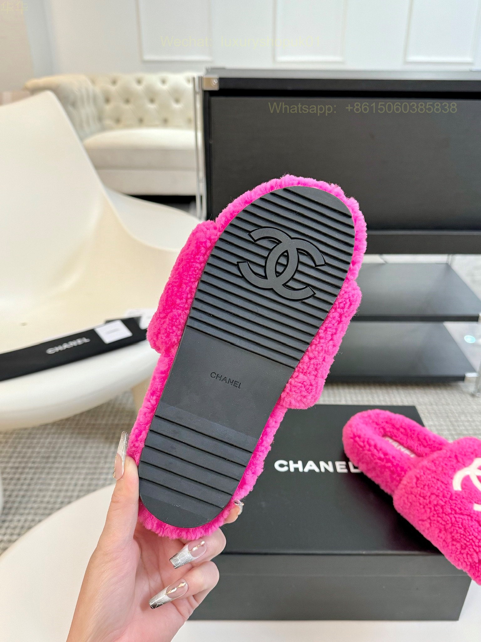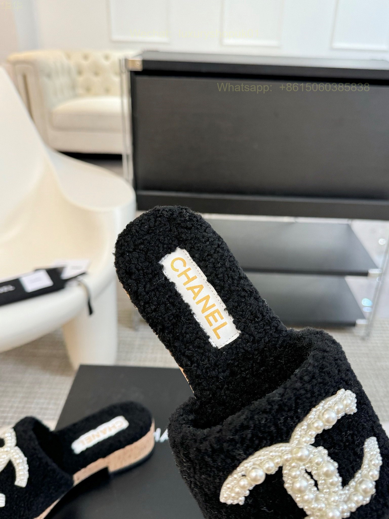 Chanel Women Faux Fur Shearling Slide Sandals Shoes