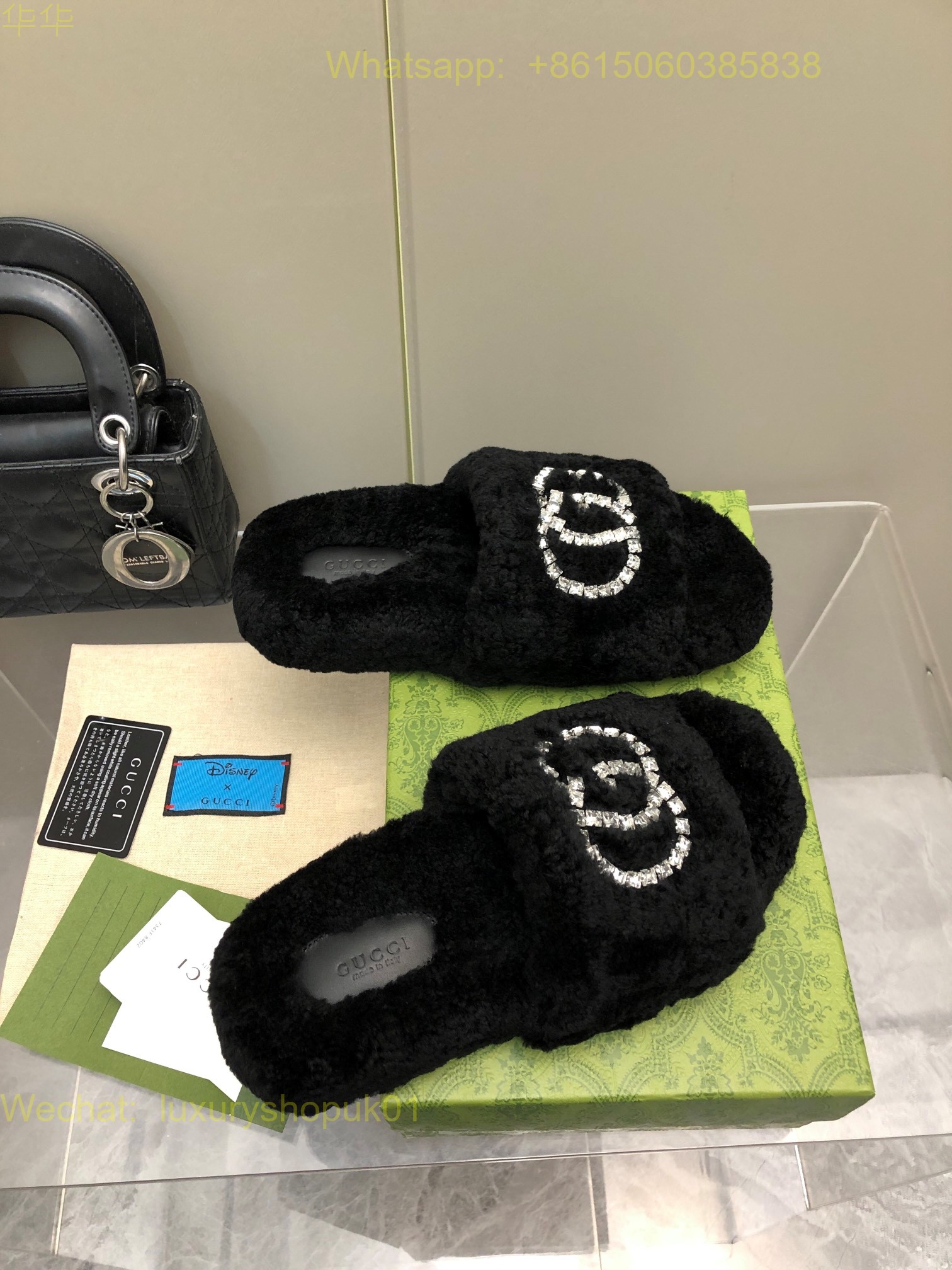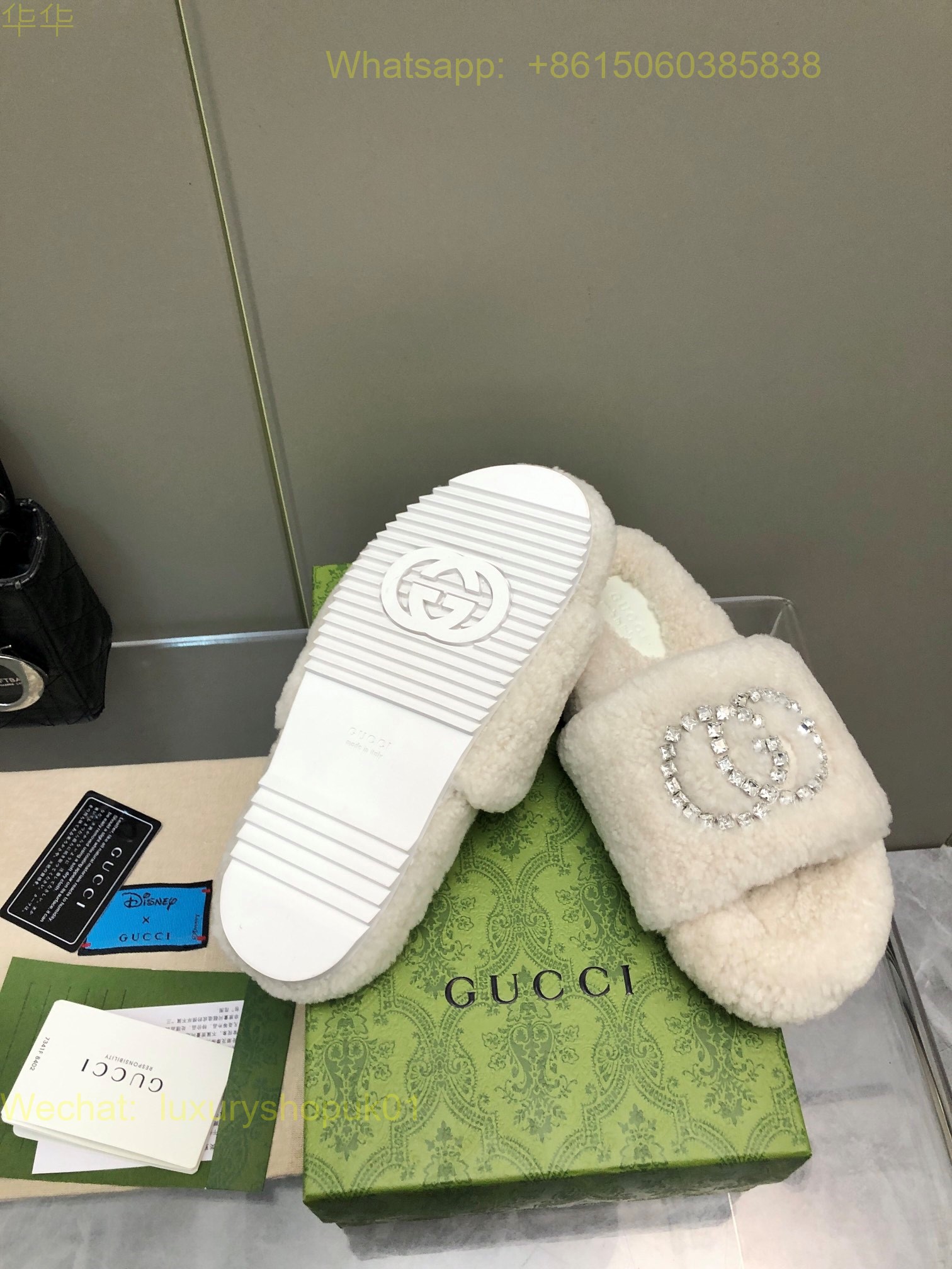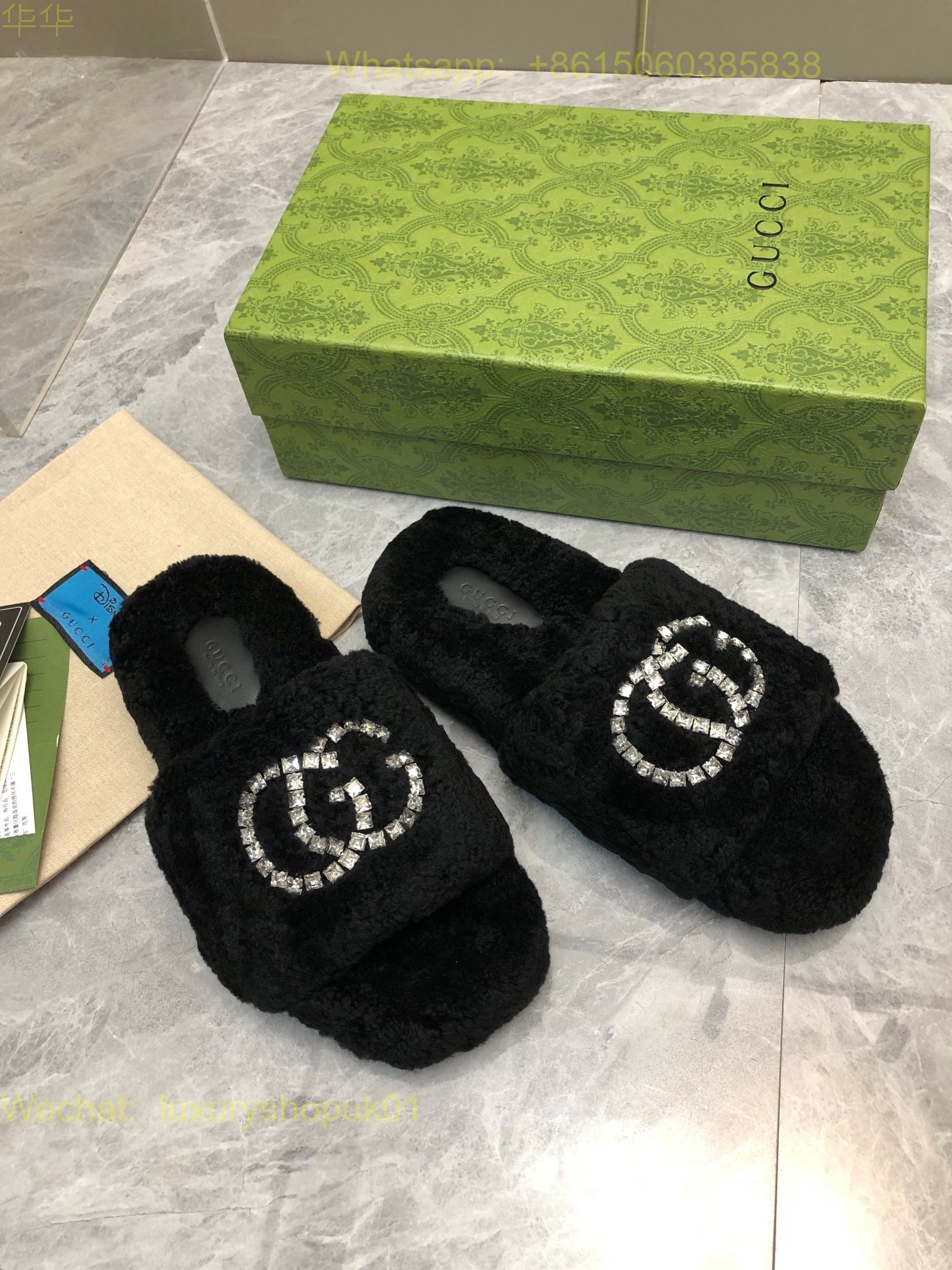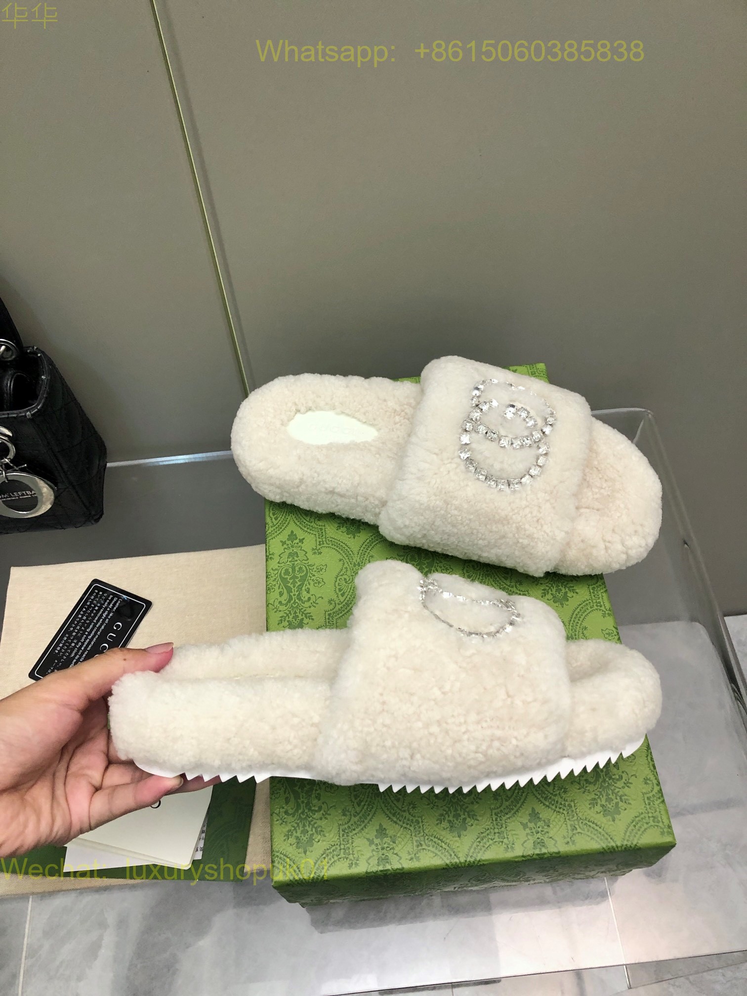 Gucci Shearling Fur Interlocking G Crystal Slides sandal Women Shoes