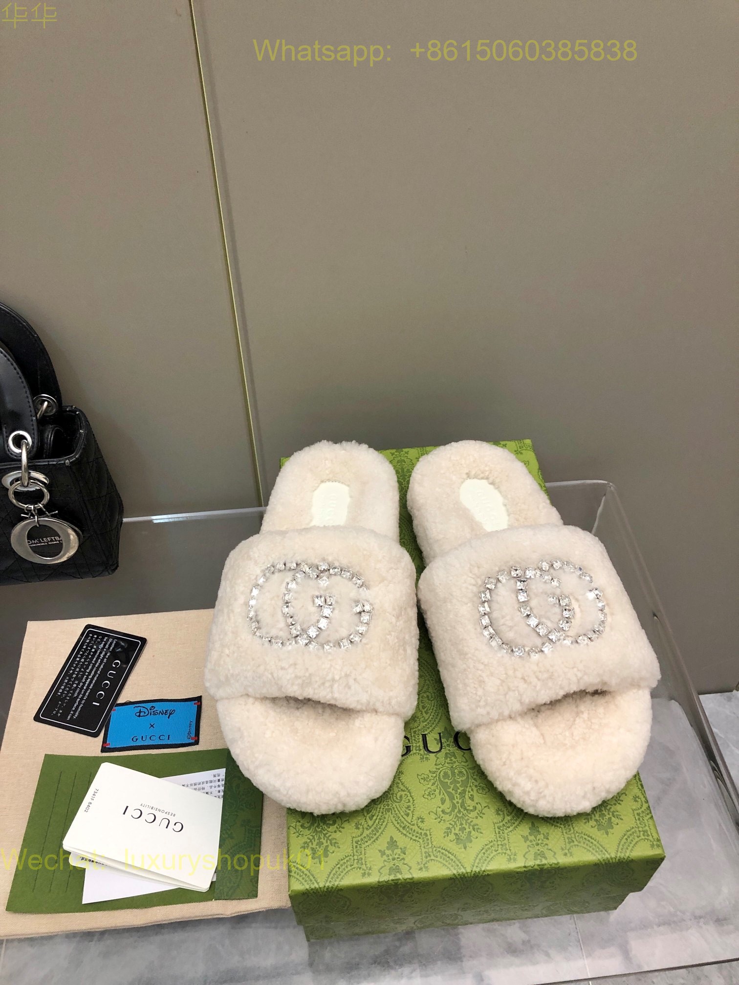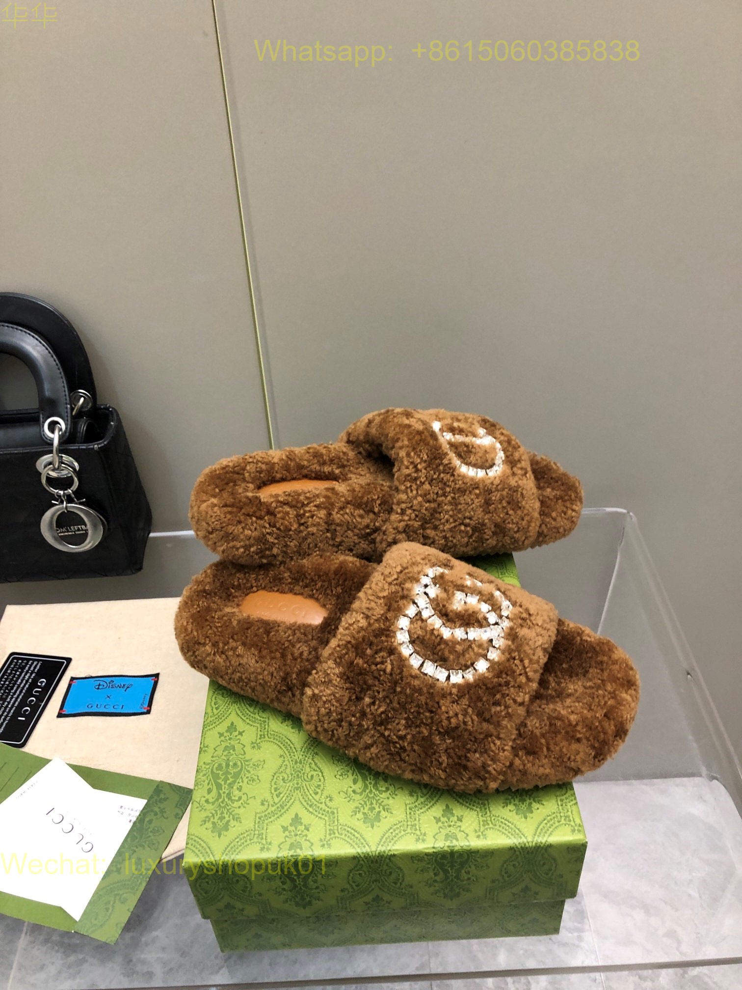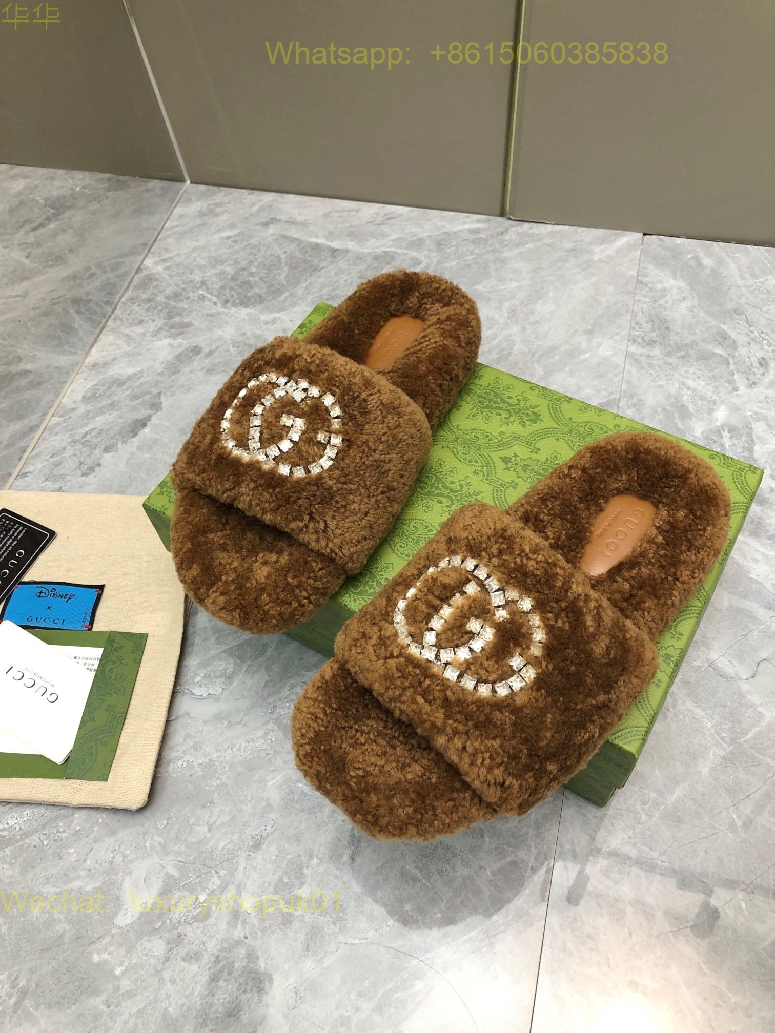 Gucci Shearling Fur Interlocking G Crystal Slides sandal Women Shoes