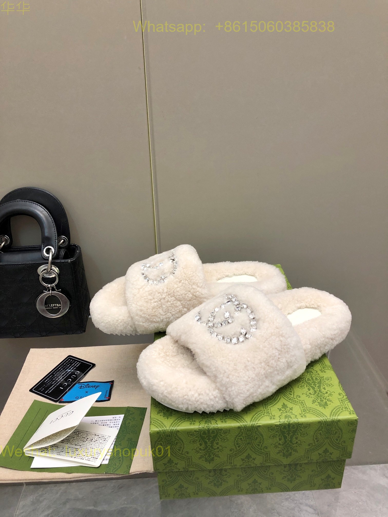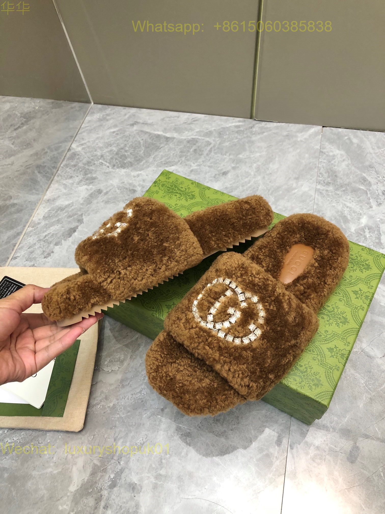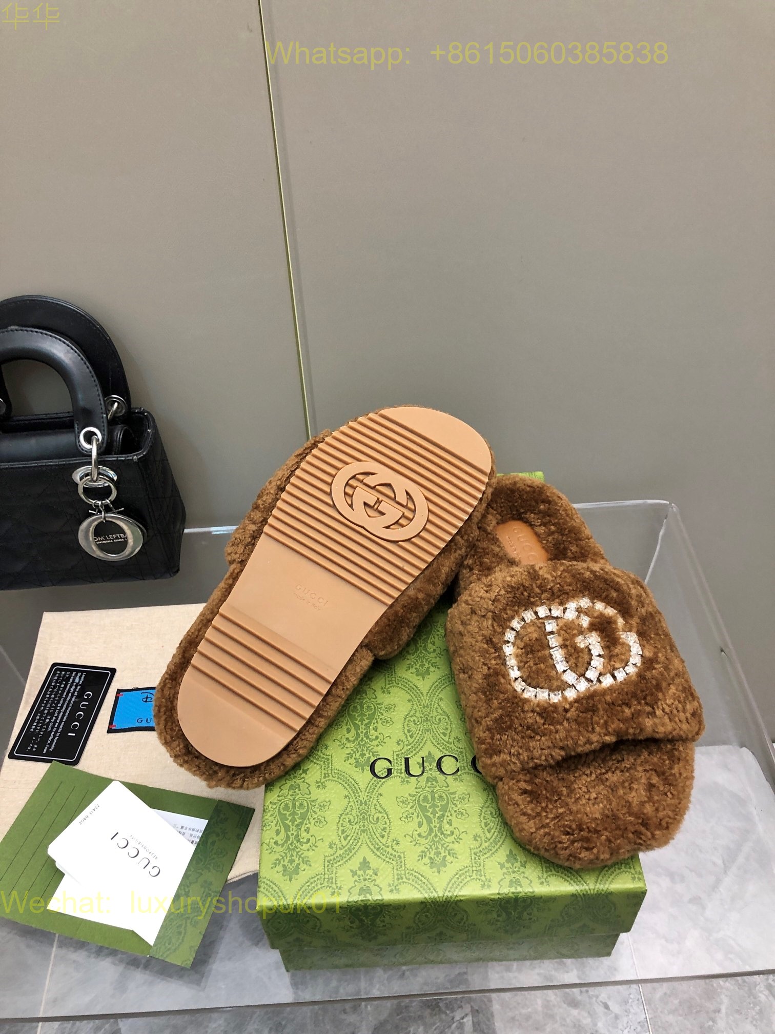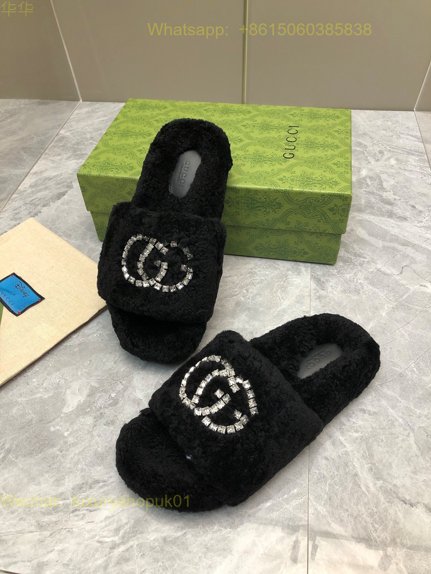 Gucci Shearling Fur Interlocking G Crystal Slides sandal Women Shoes
