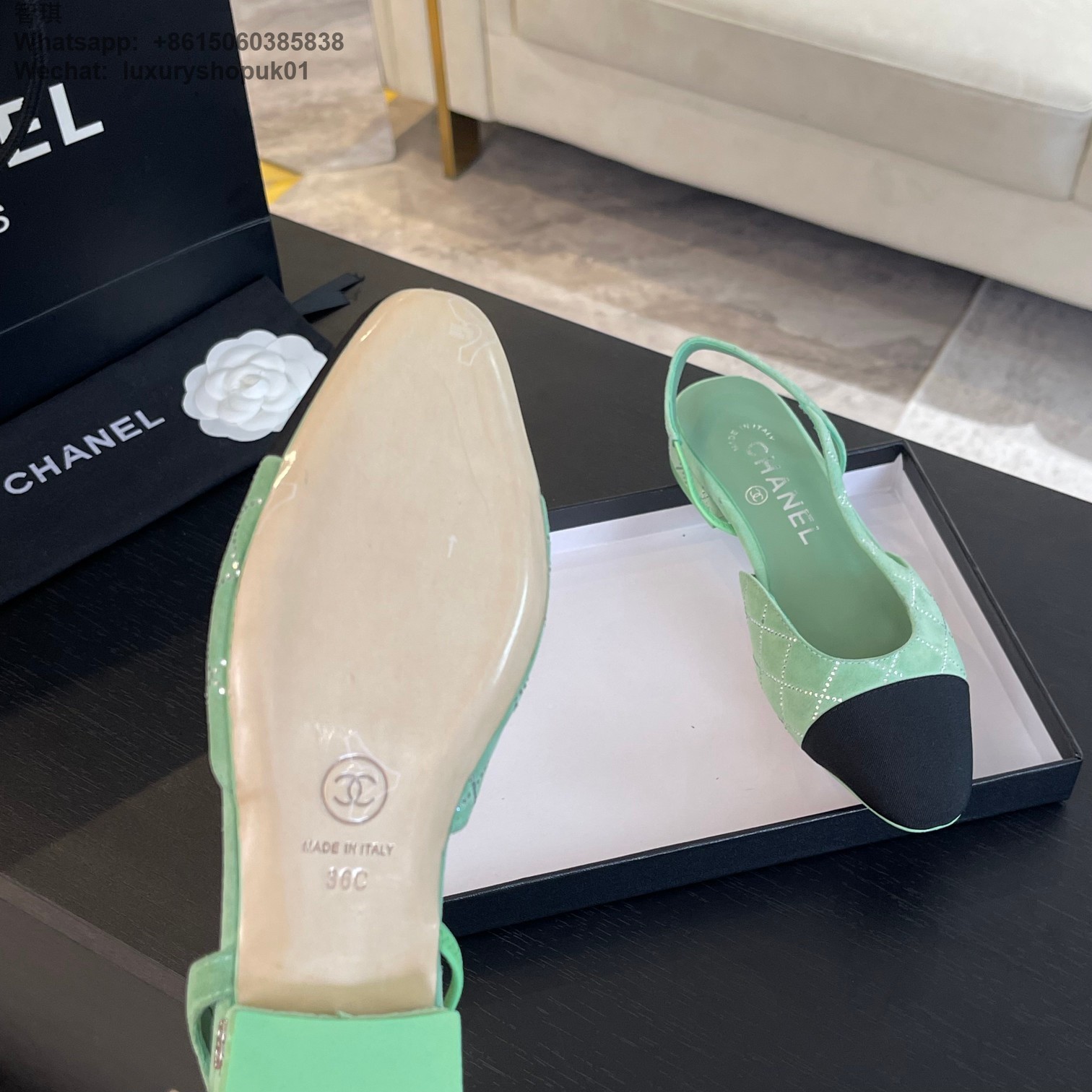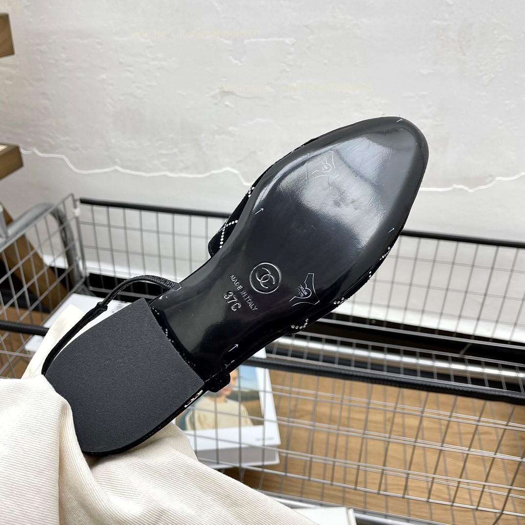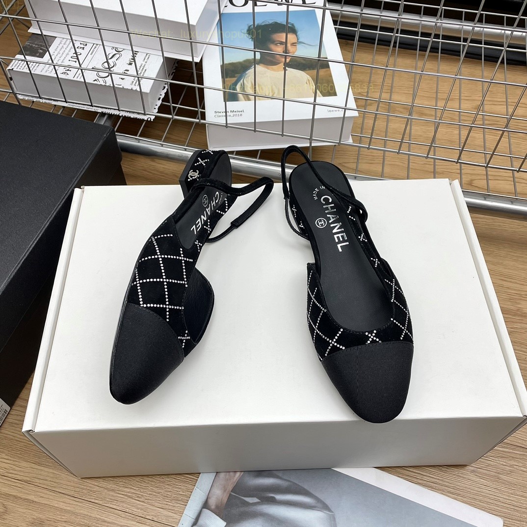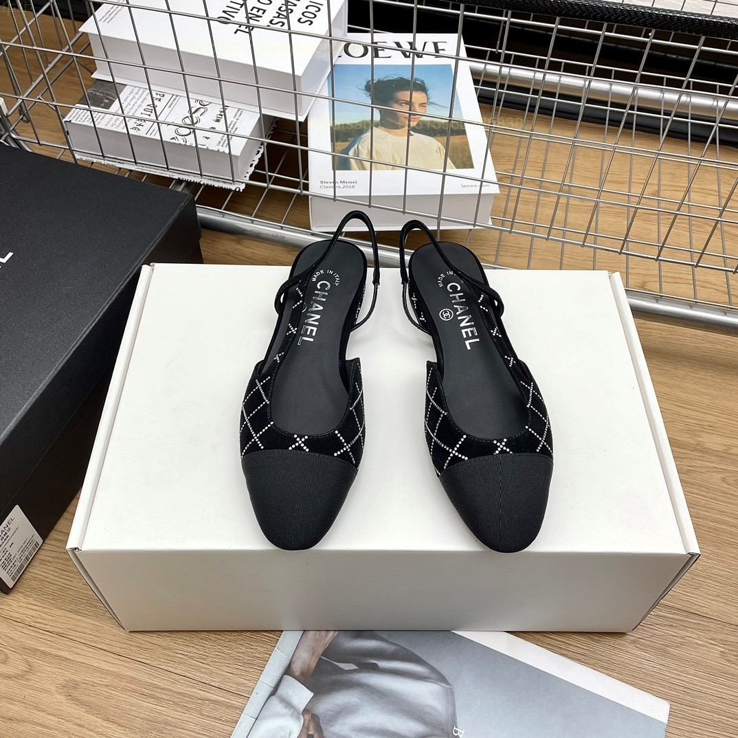 Women Chanel Leather Fabric Cap Toe Slingback Flats Sandals CC Logo Tweed Ballet Shoes