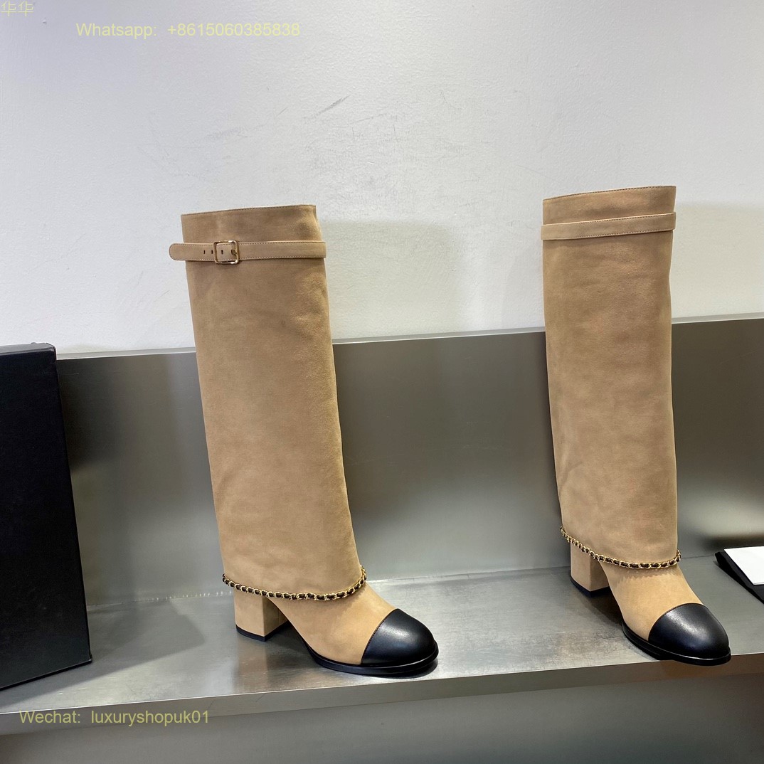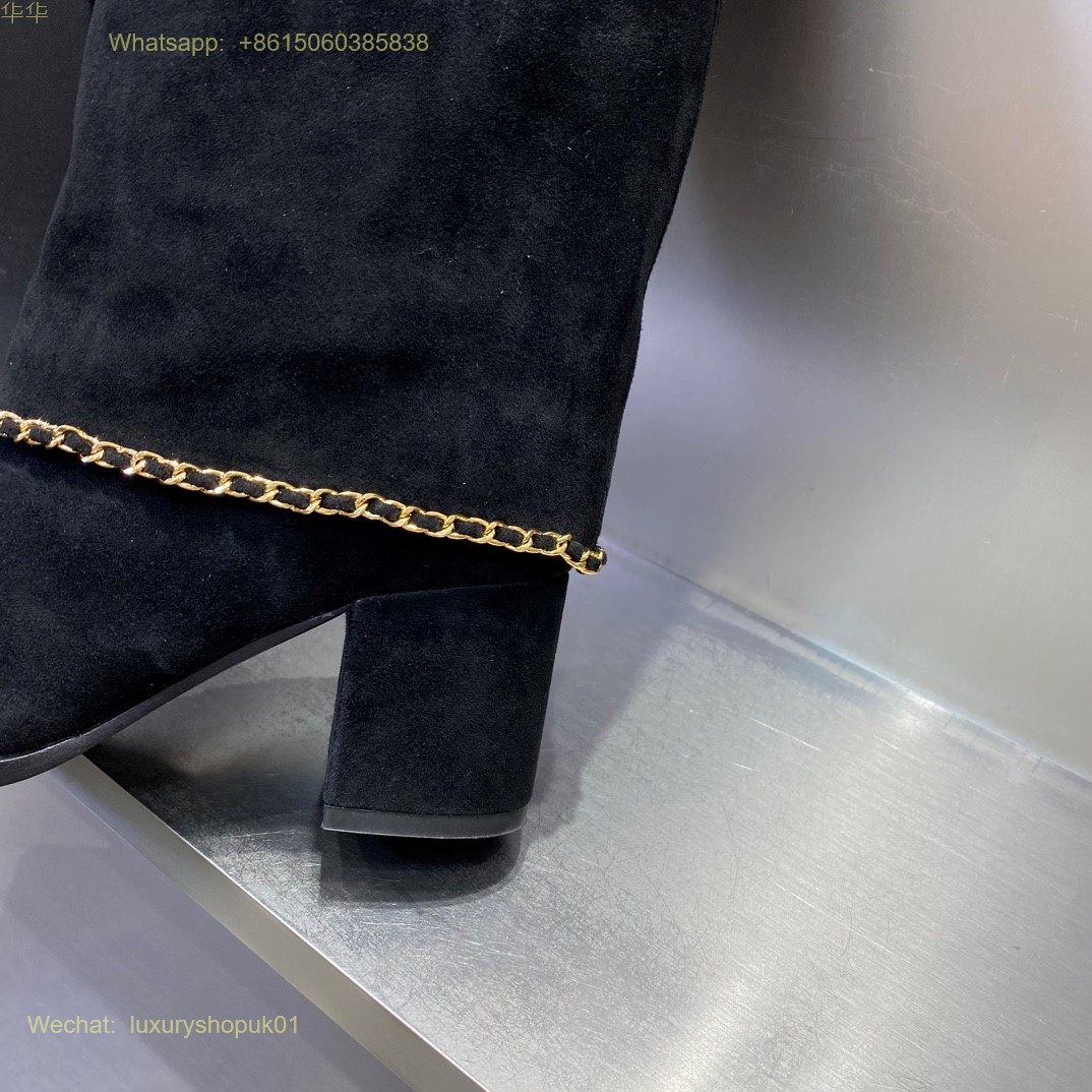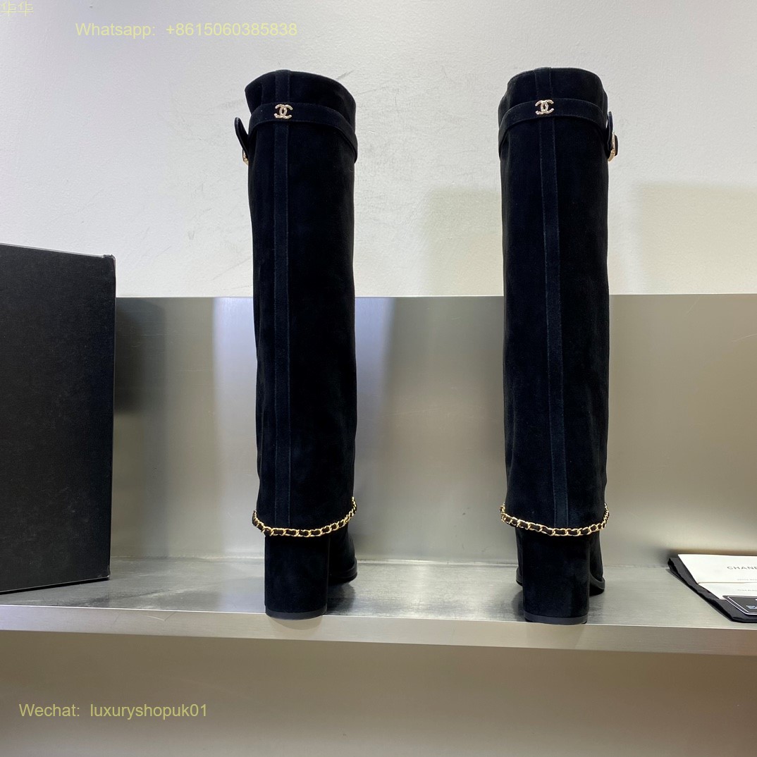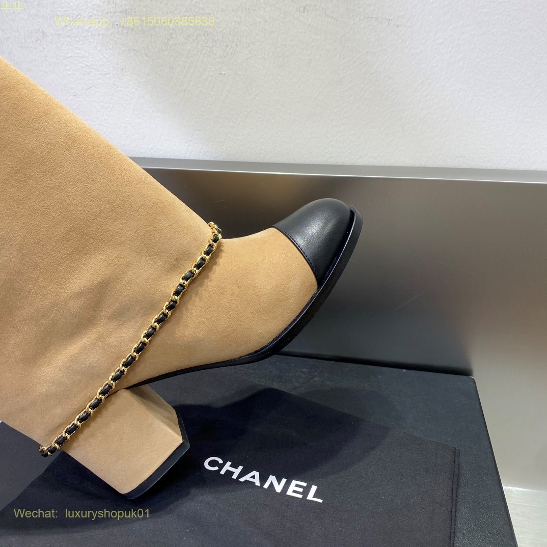 Chanel chain suede leather block heels knee high Boots CC Logo Women Shoes