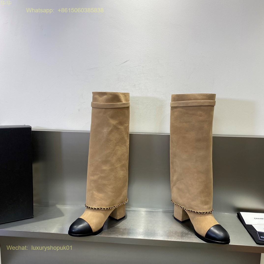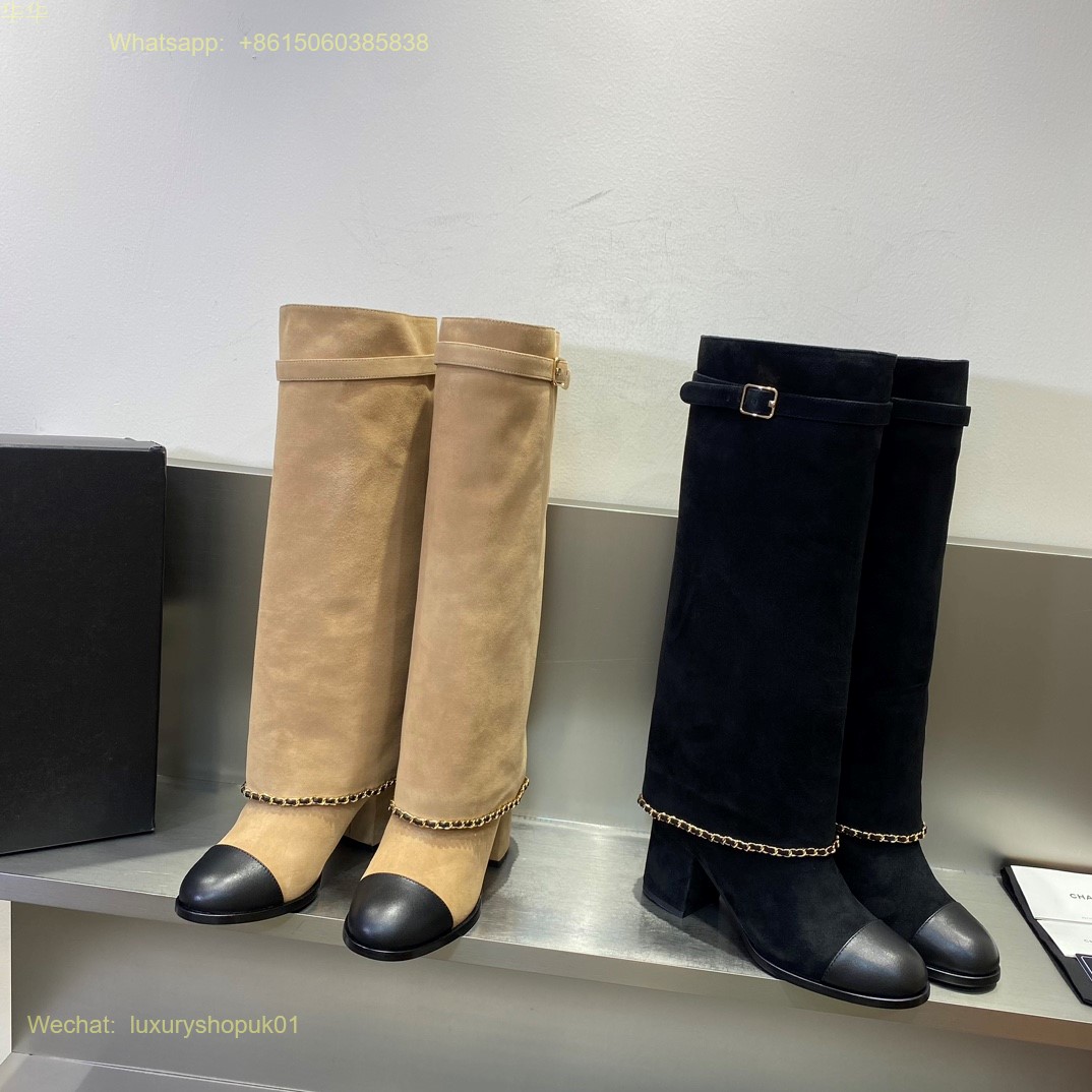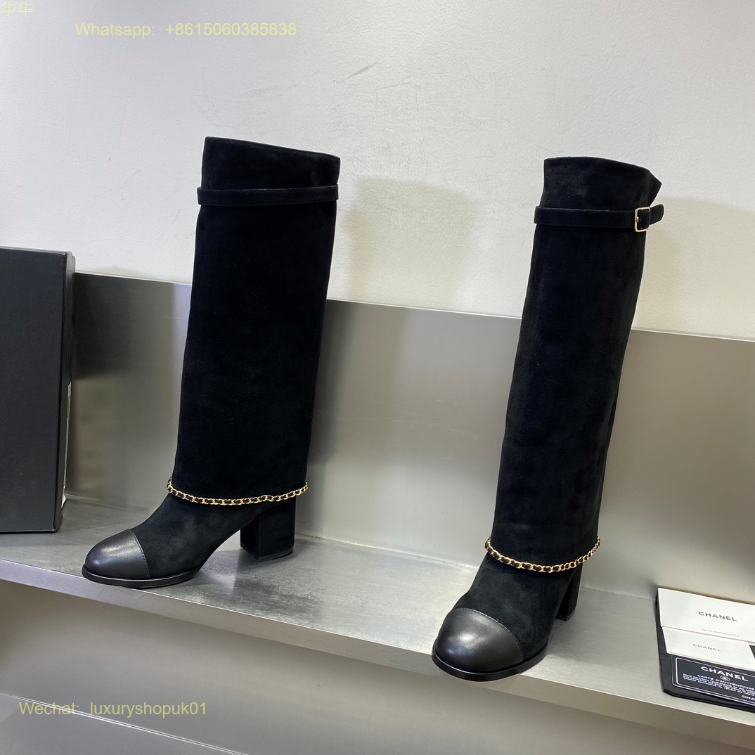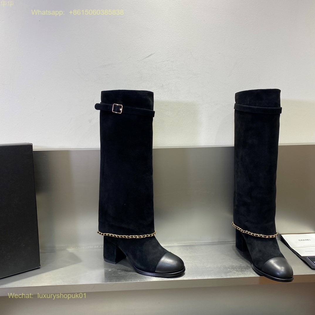 Chanel chain suede leather block heels knee high Boots CC Logo Women Shoes