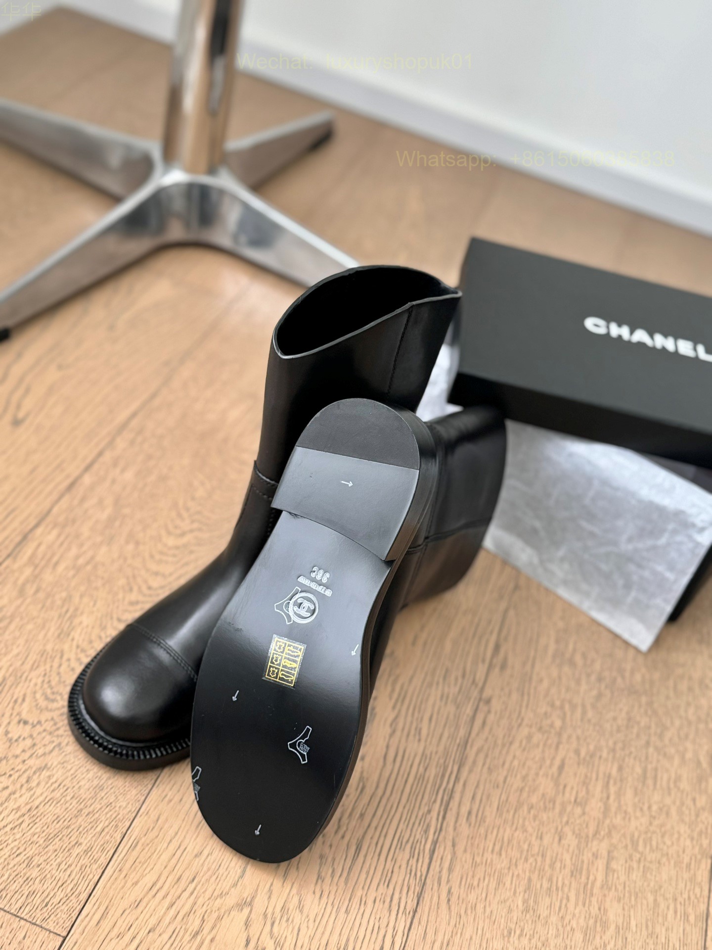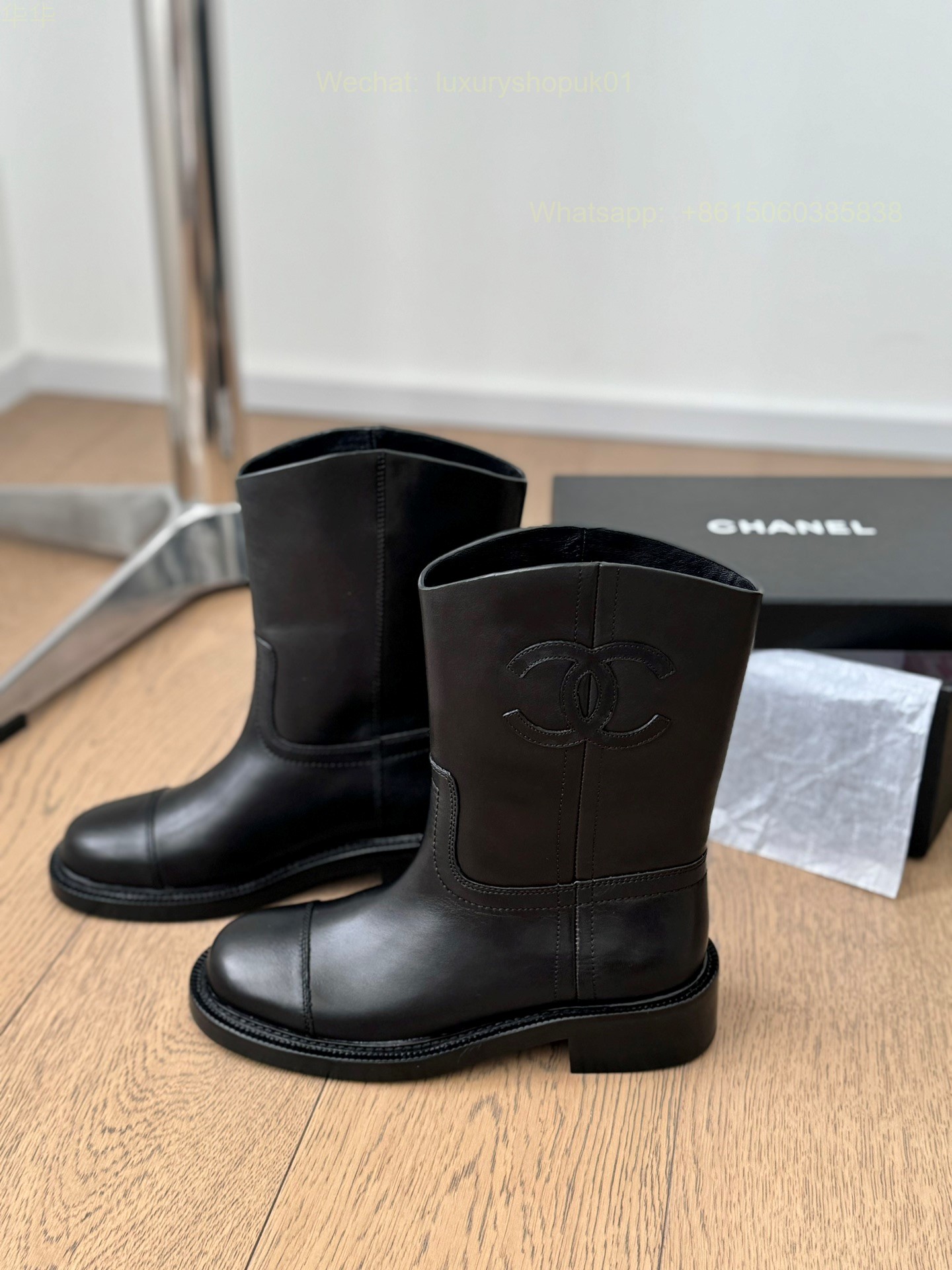 Chanel Black Leather Flat Boot CC Logo Women Shoes
