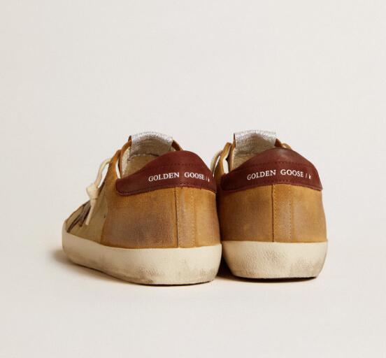 Golden Goose GGDB Mens Sneaker Shoes Super-Star in beige and caramel suede with black crackle leather star