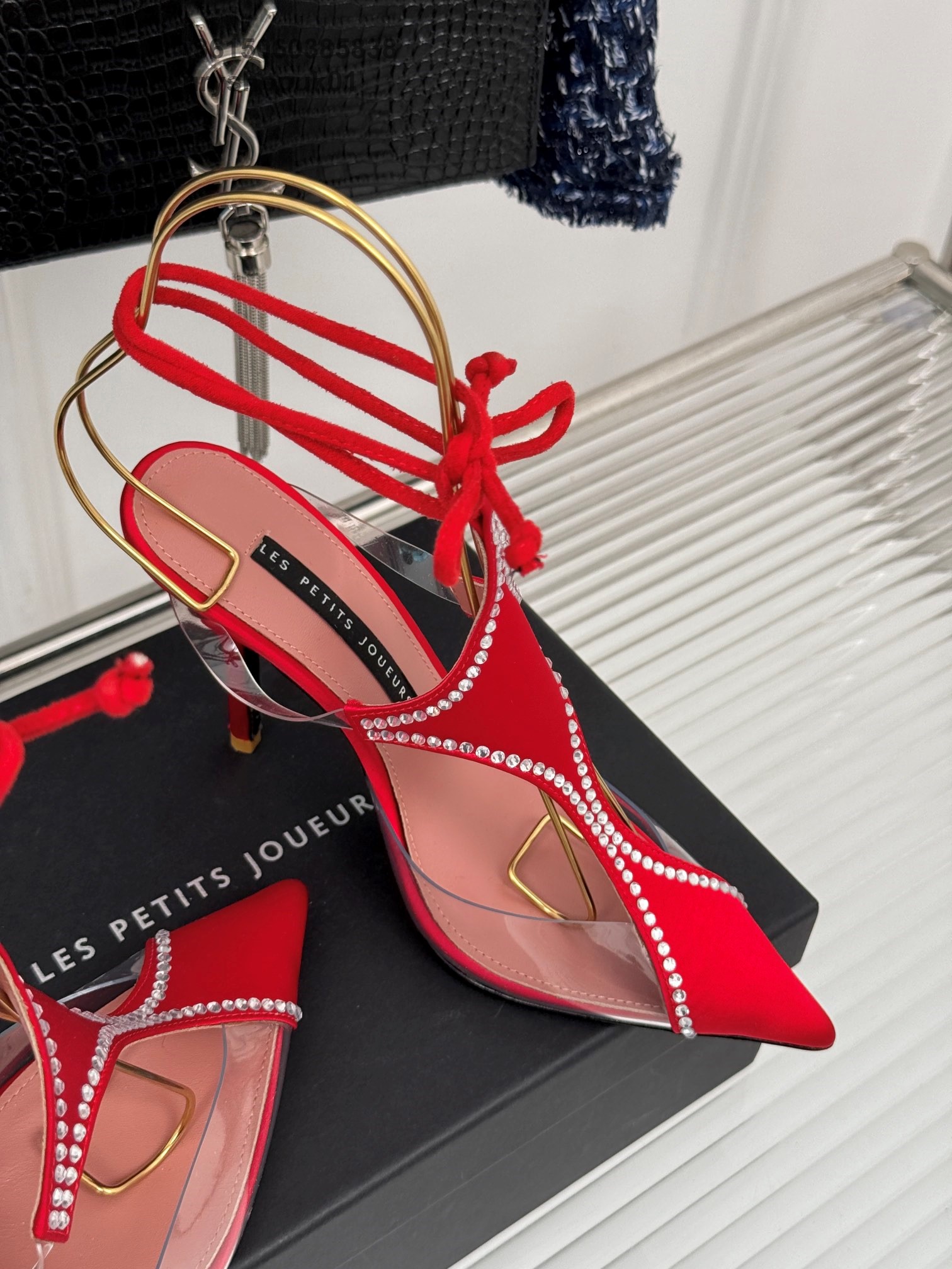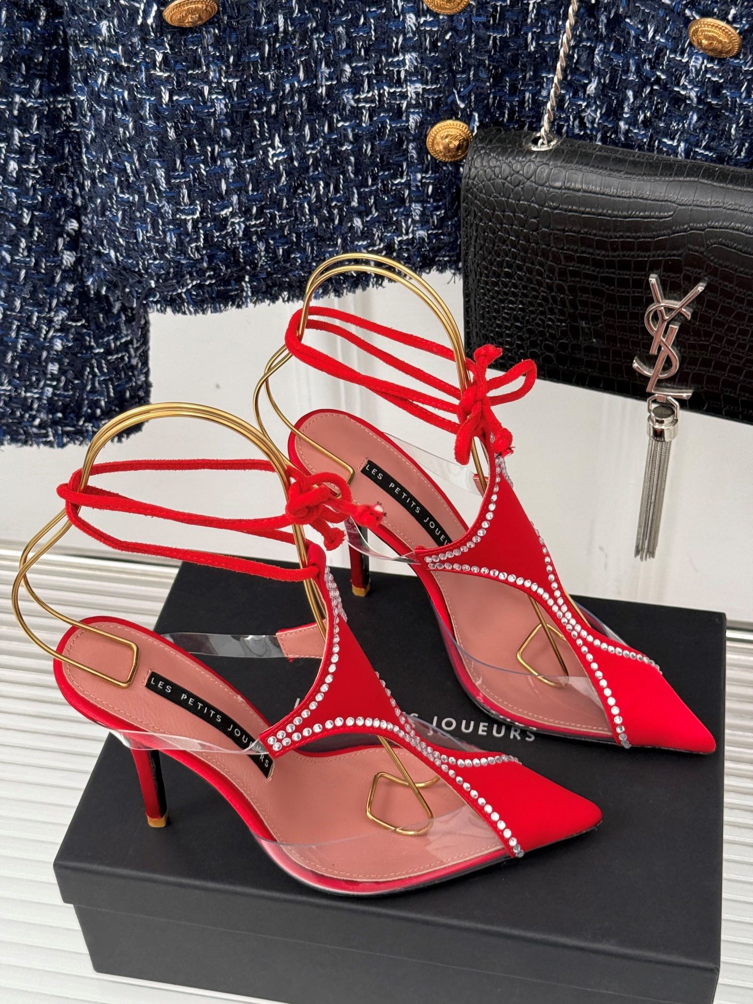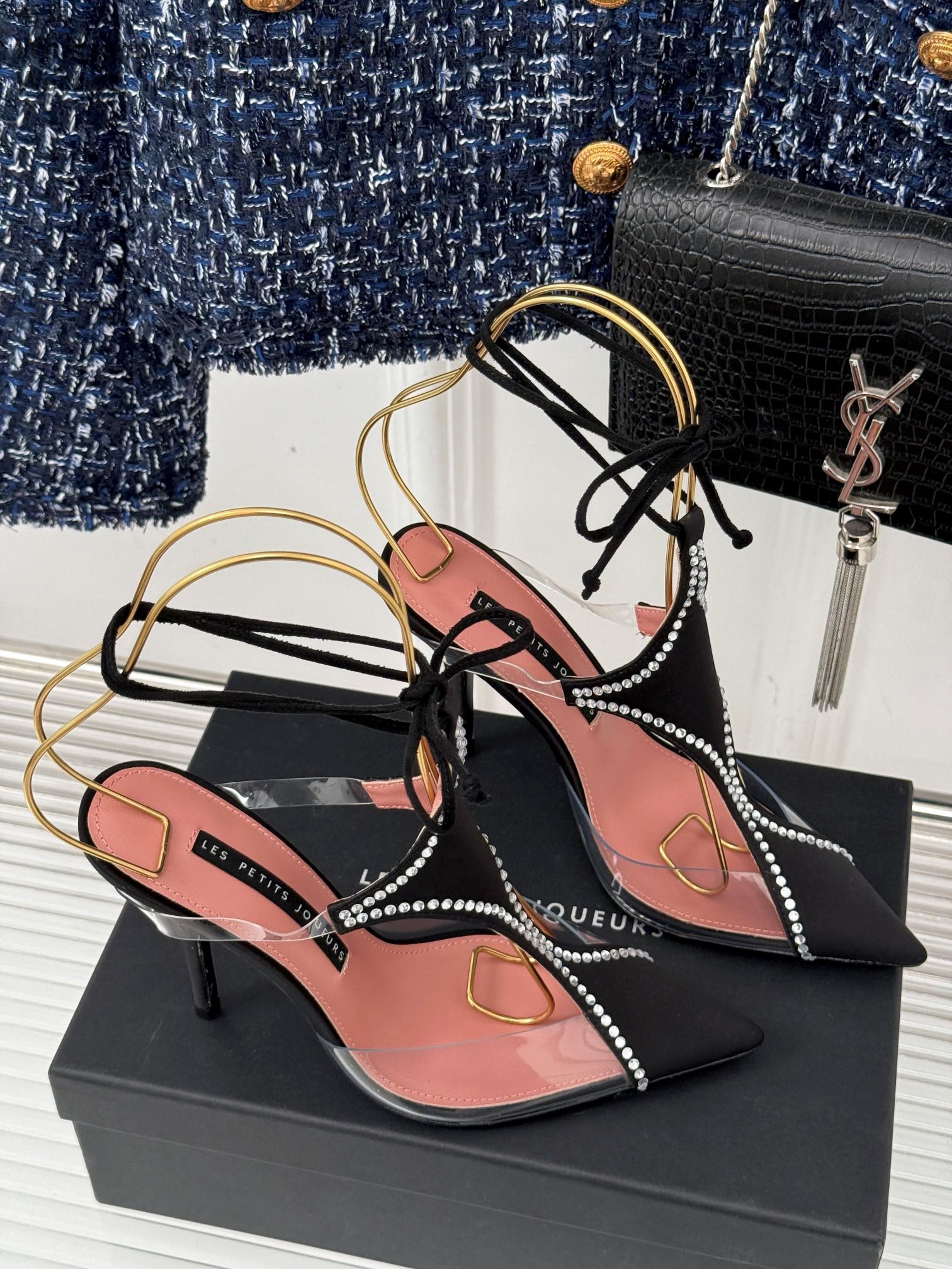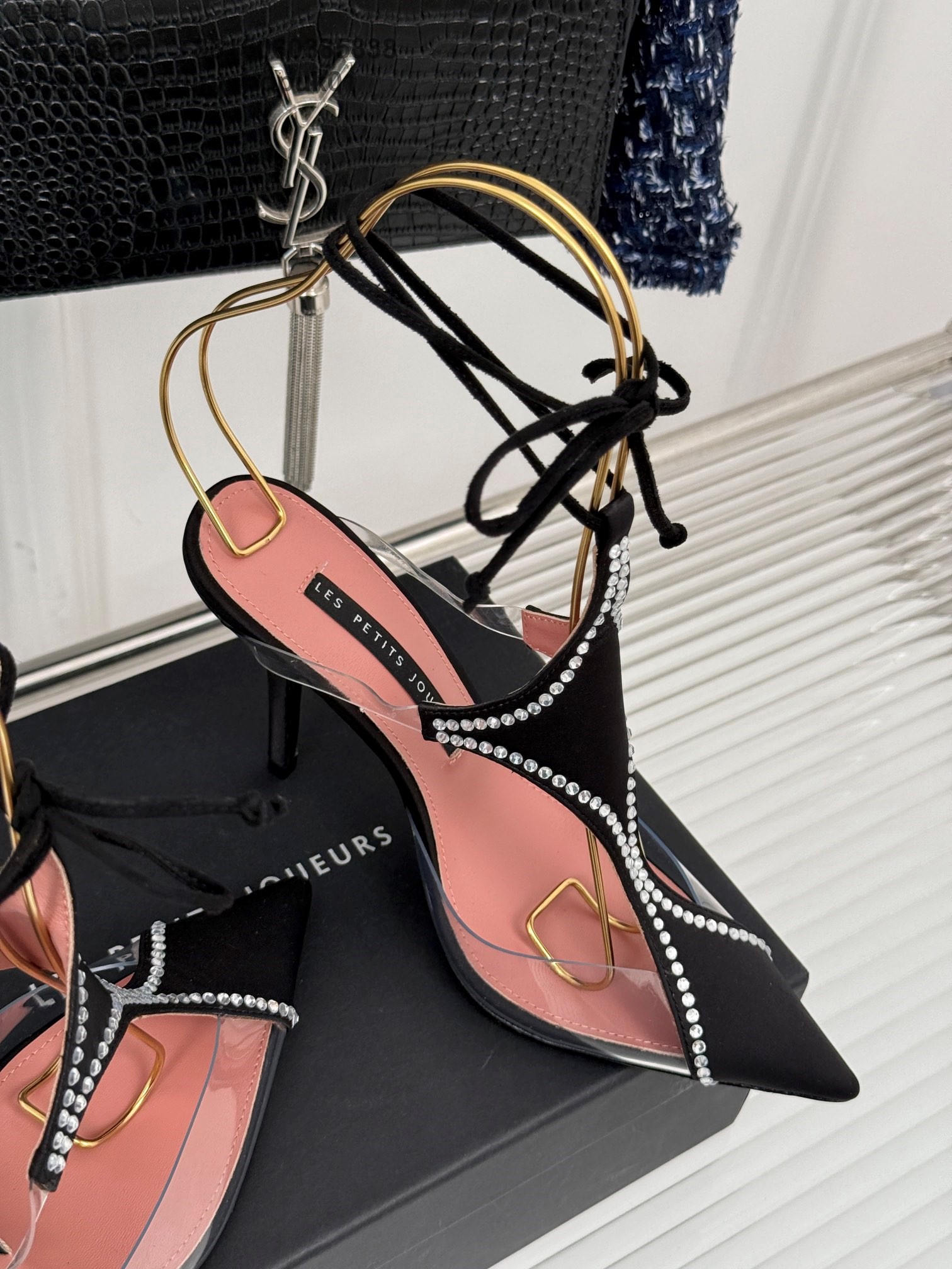 LES PETITS JOUEURS Virgo Paneled satin PVC Pointed toe Wraparound ankle strap stiletto heels Sandal