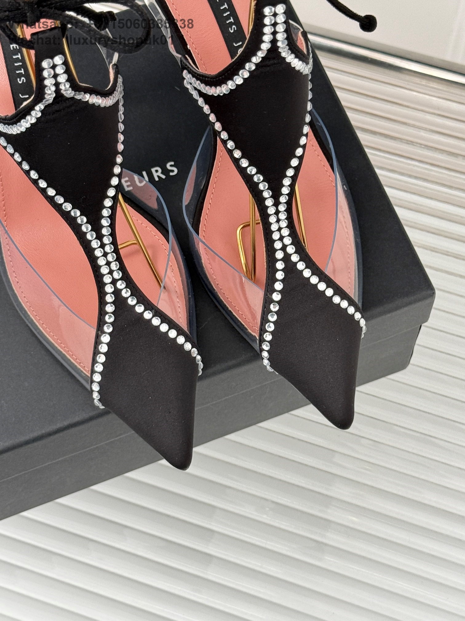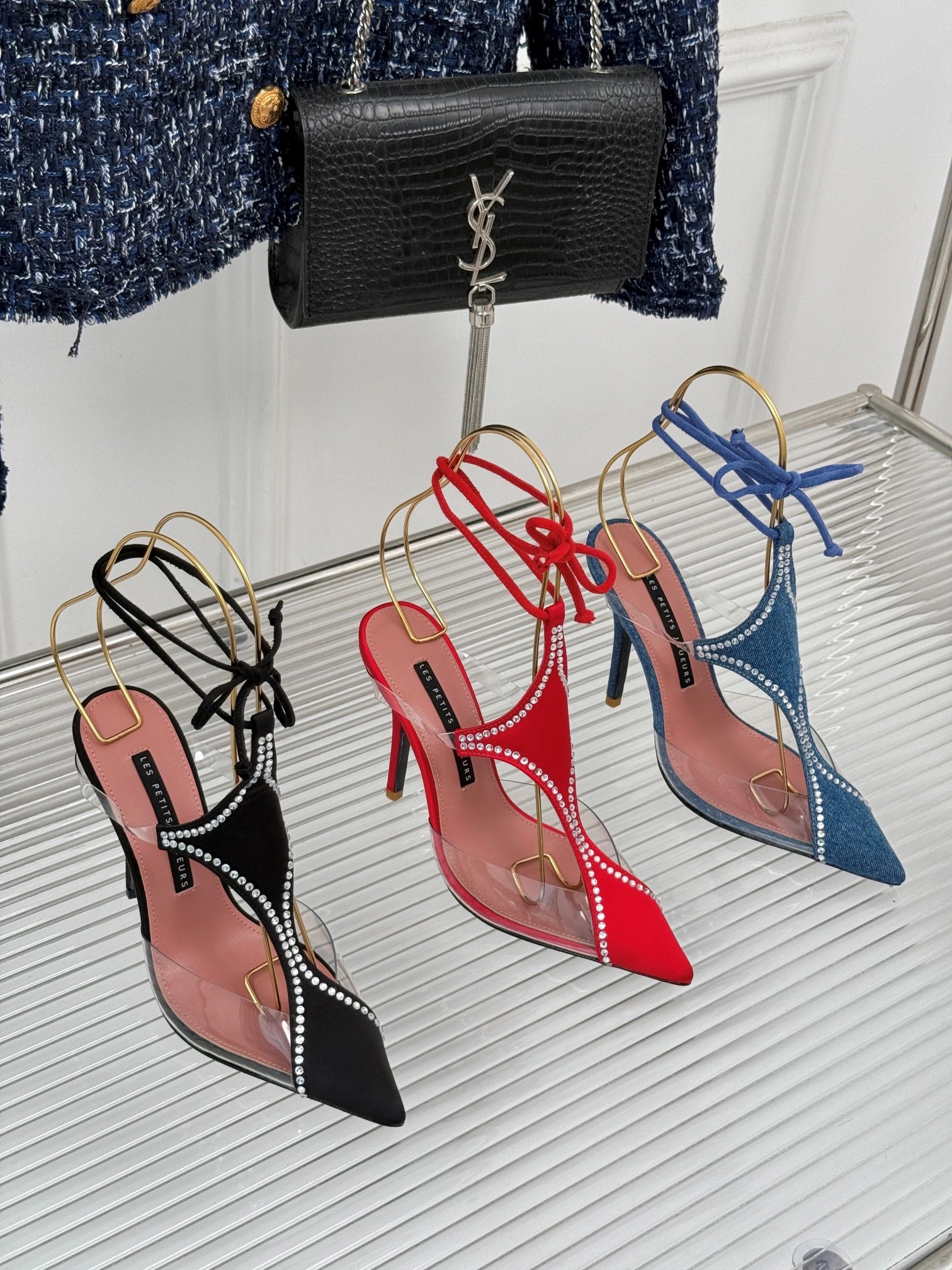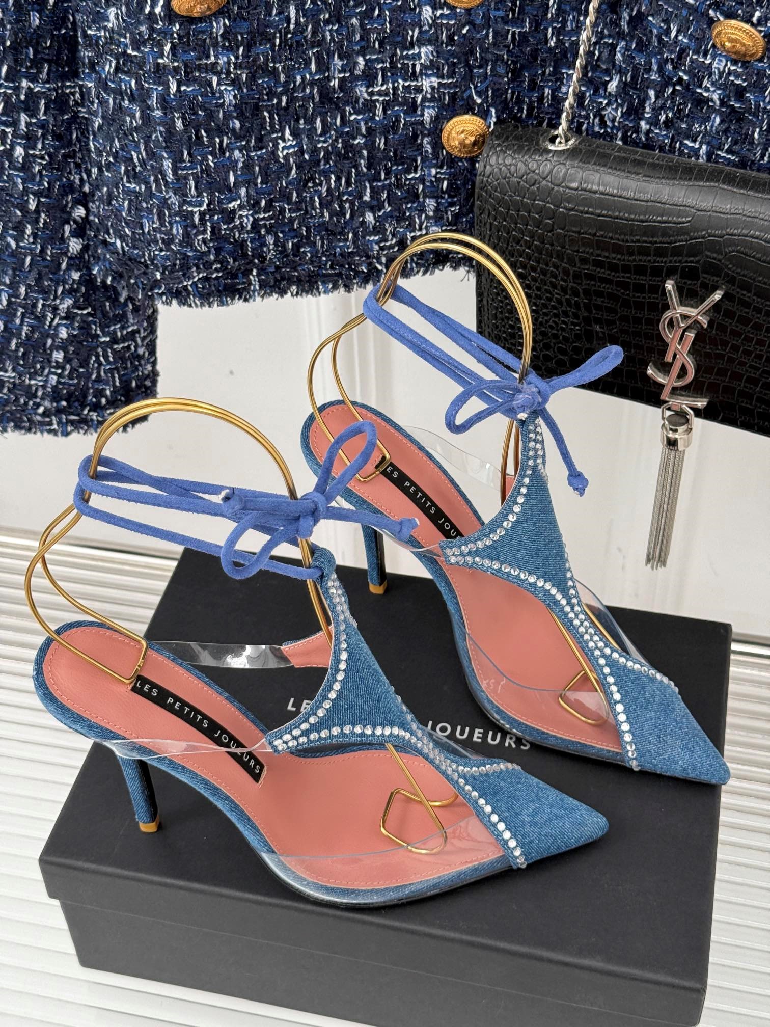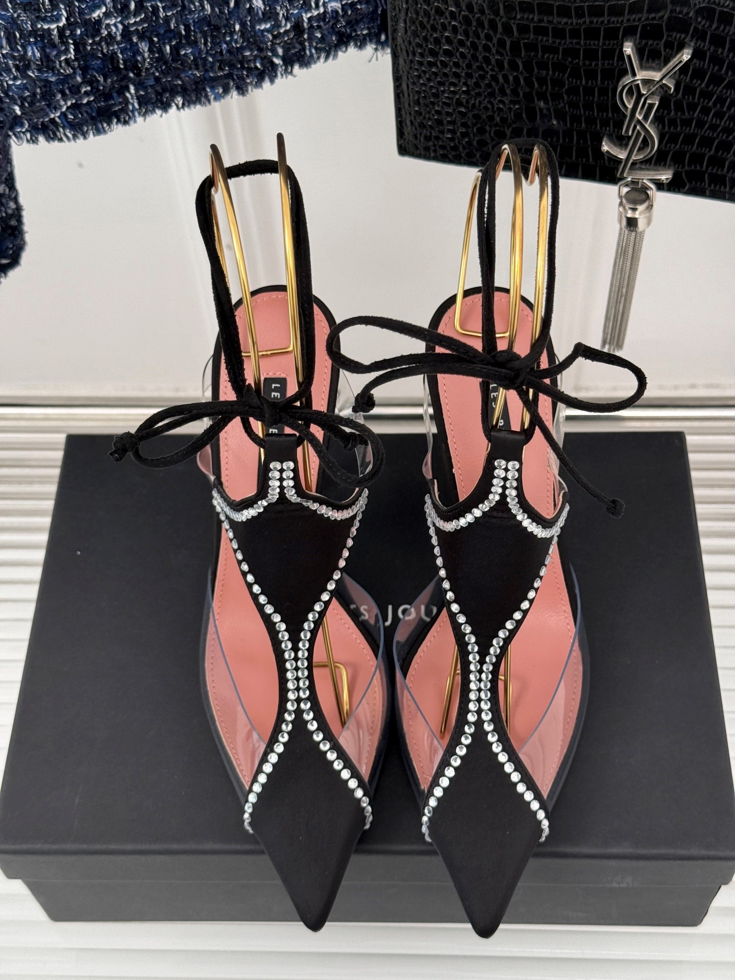 LES PETITS JOUEURS Virgo Paneled satin PVC Pointed toe Wraparound ankle strap stiletto heels Sandal