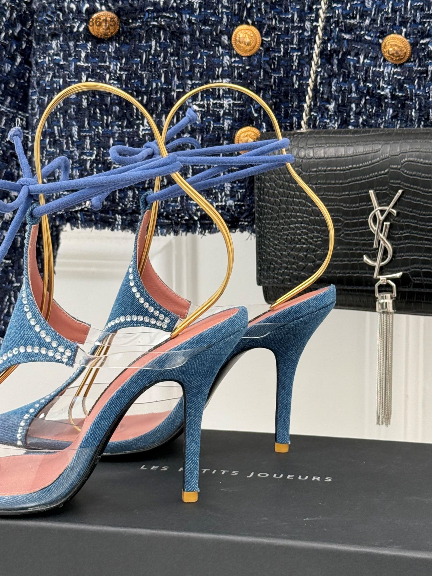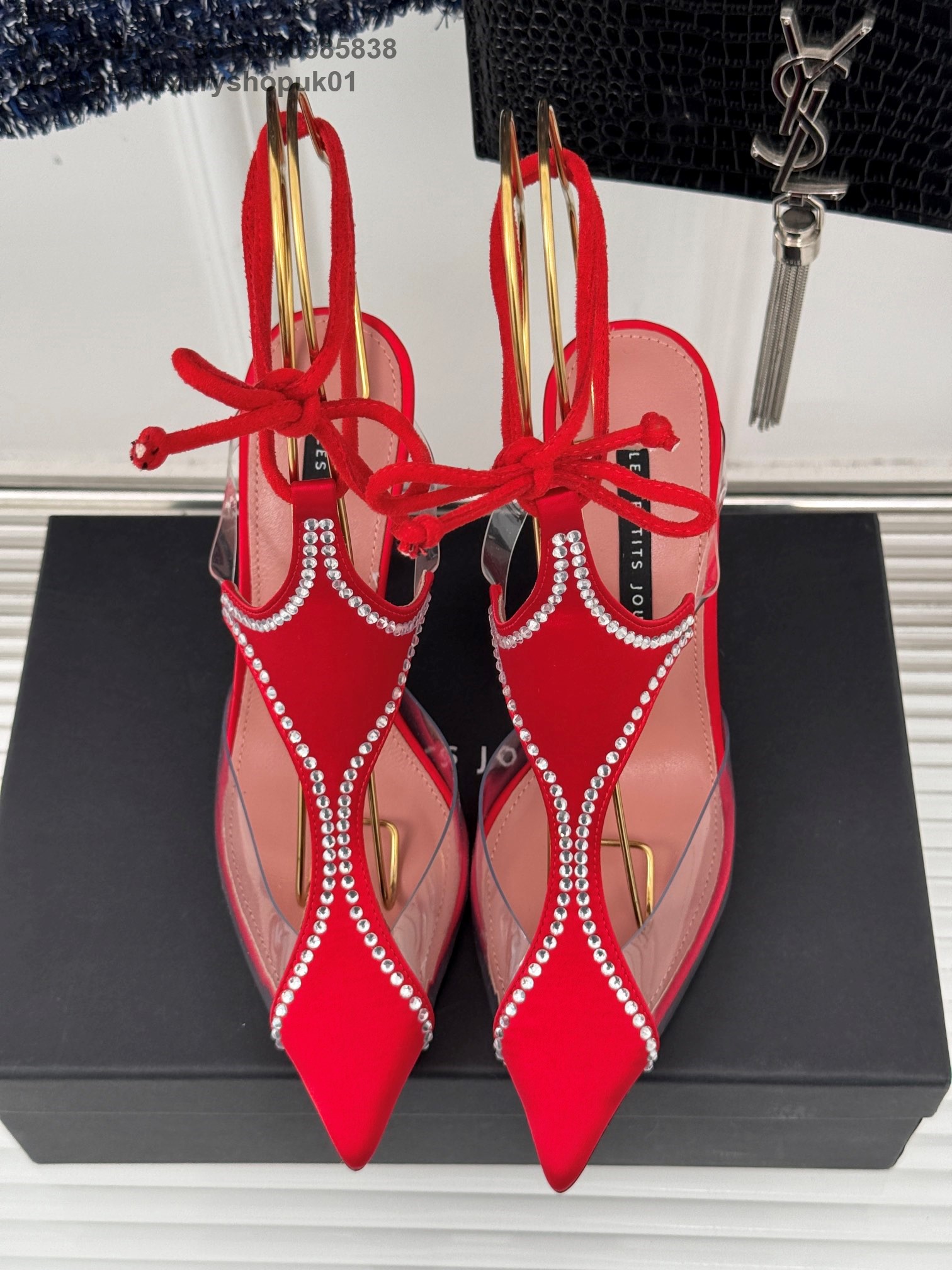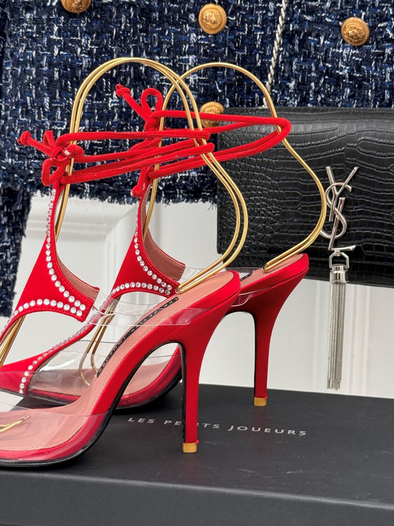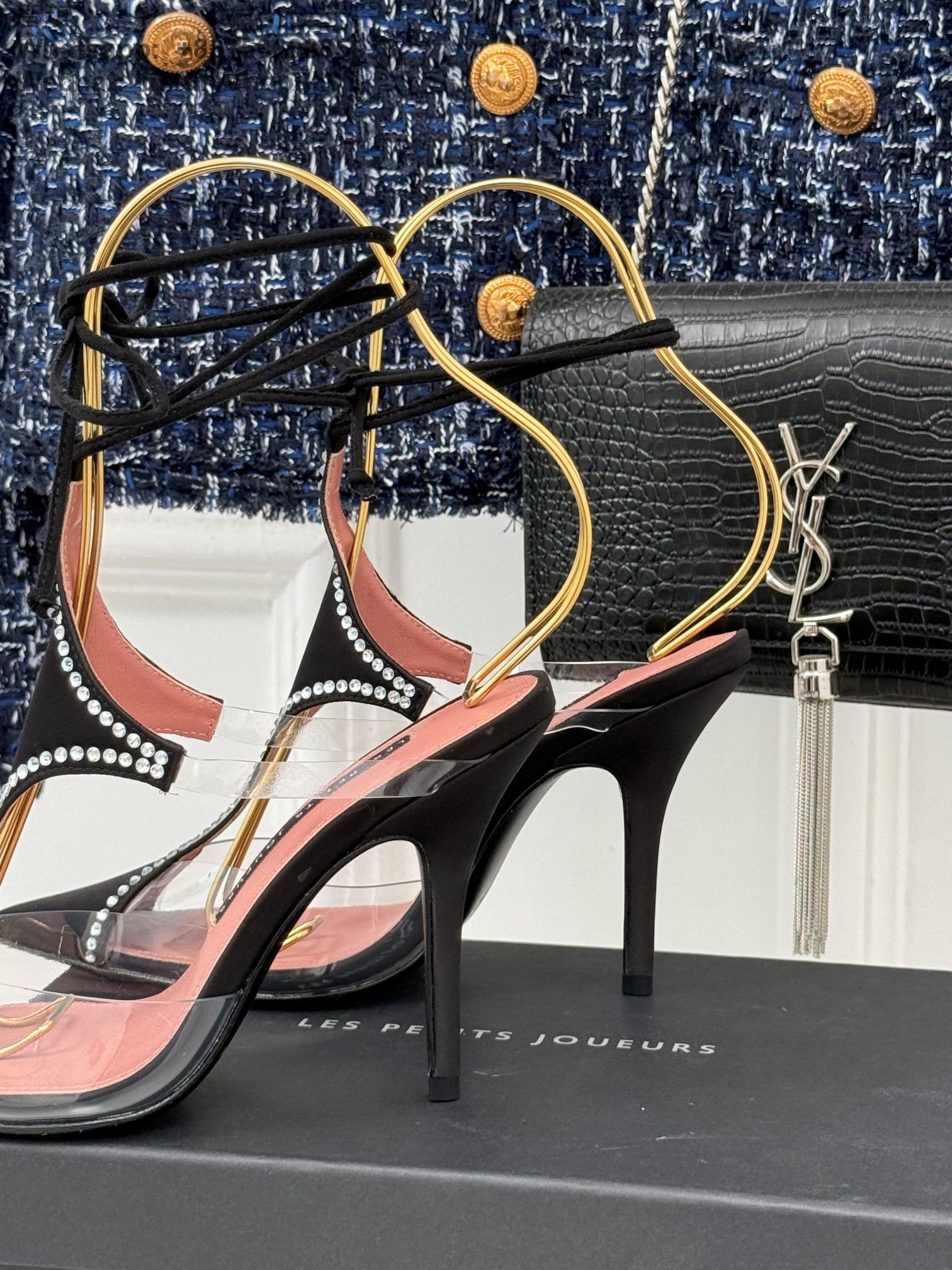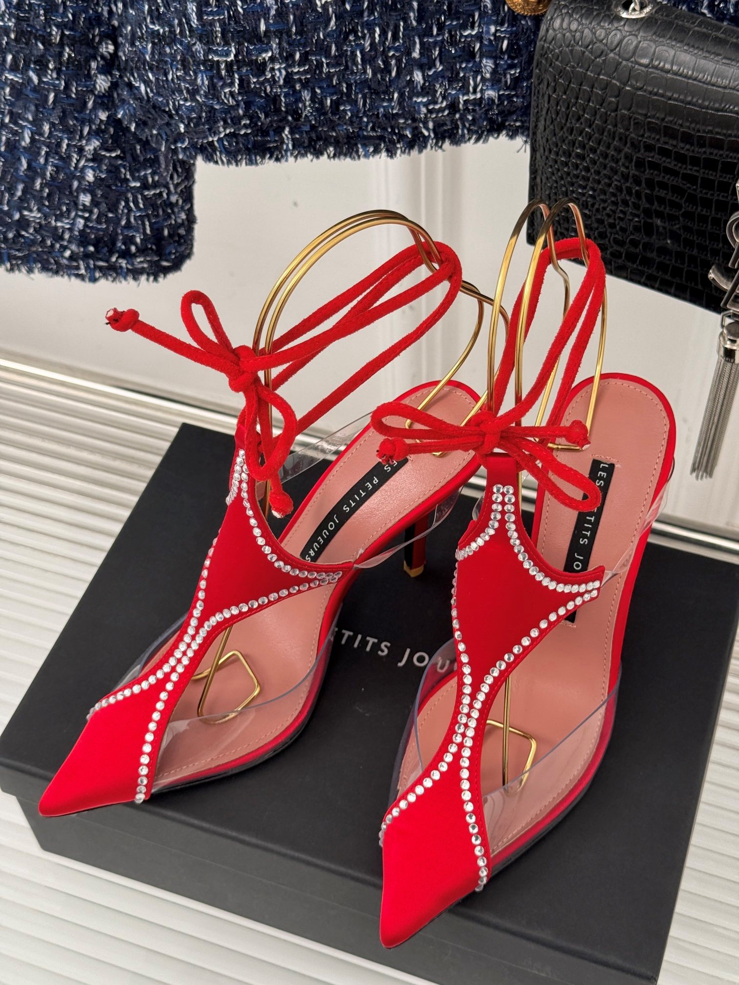 LES PETITS JOUEURS Virgo Paneled satin PVC Pointed toe Wraparound ankle strap stiletto heels Sandal