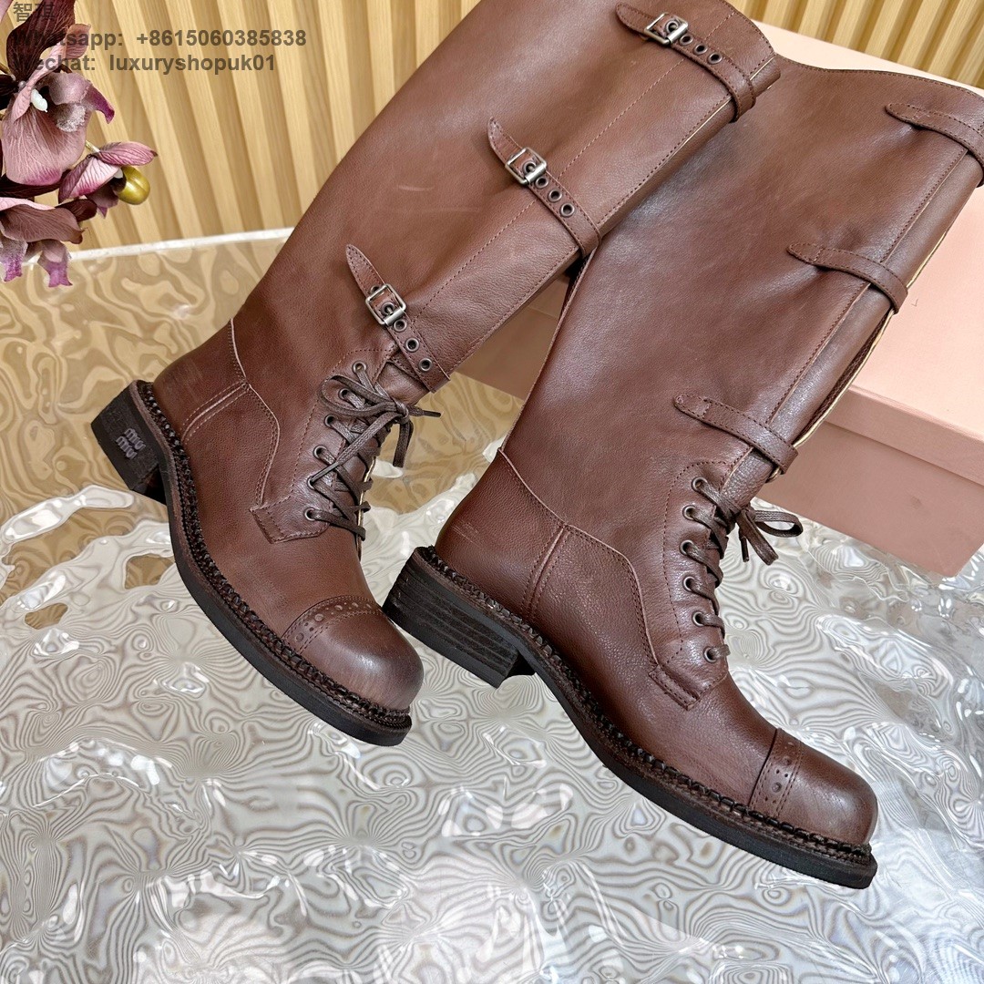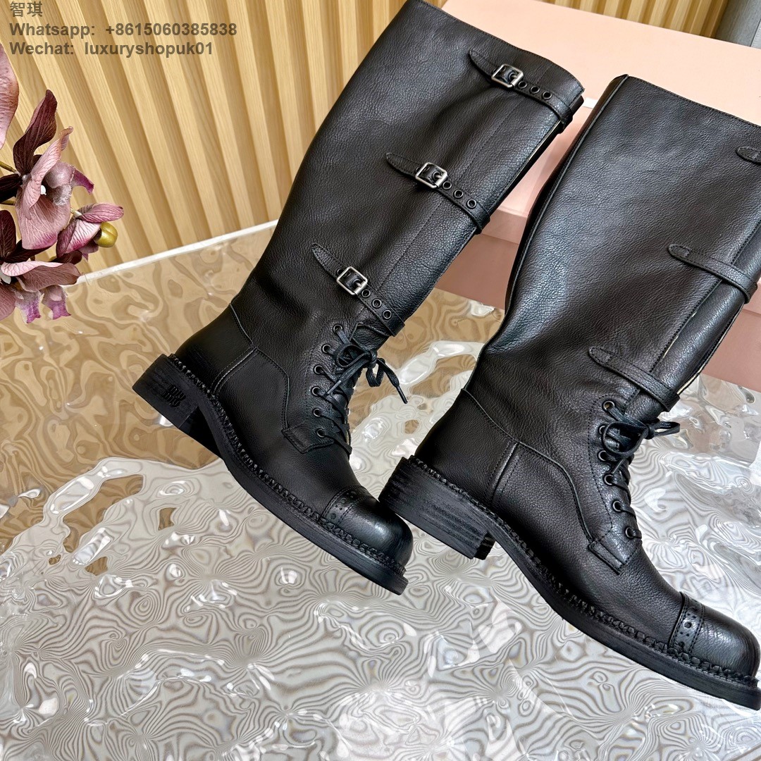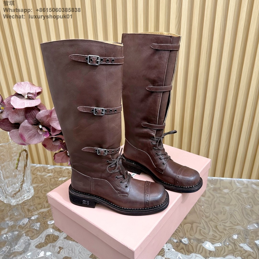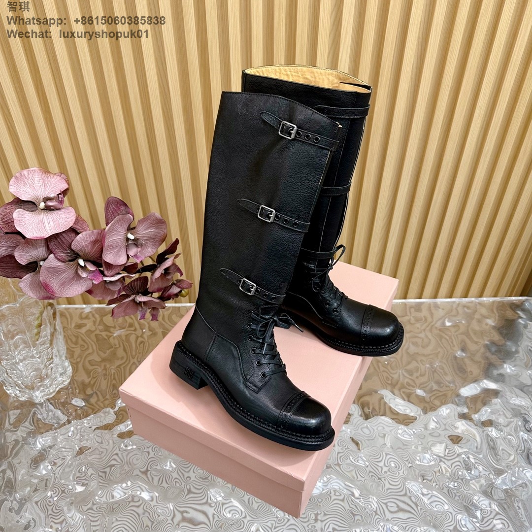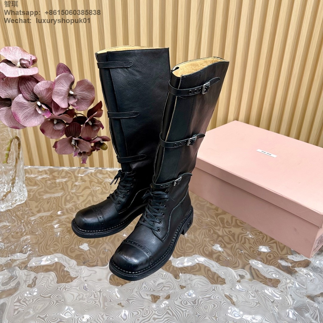 Women Miu Miu Buckled Leather Knee High Biker Boots Shoes