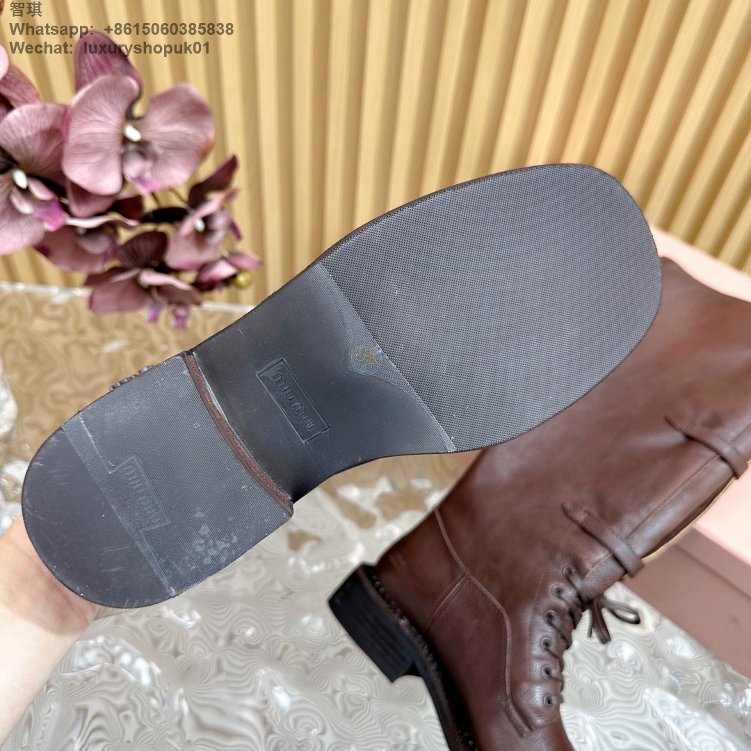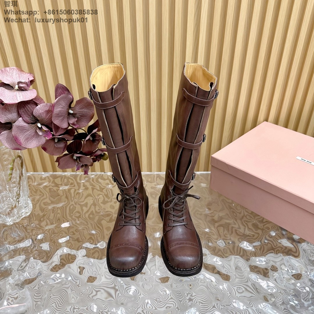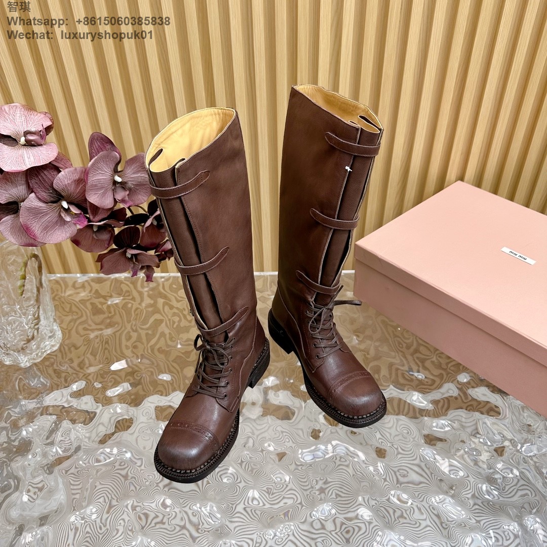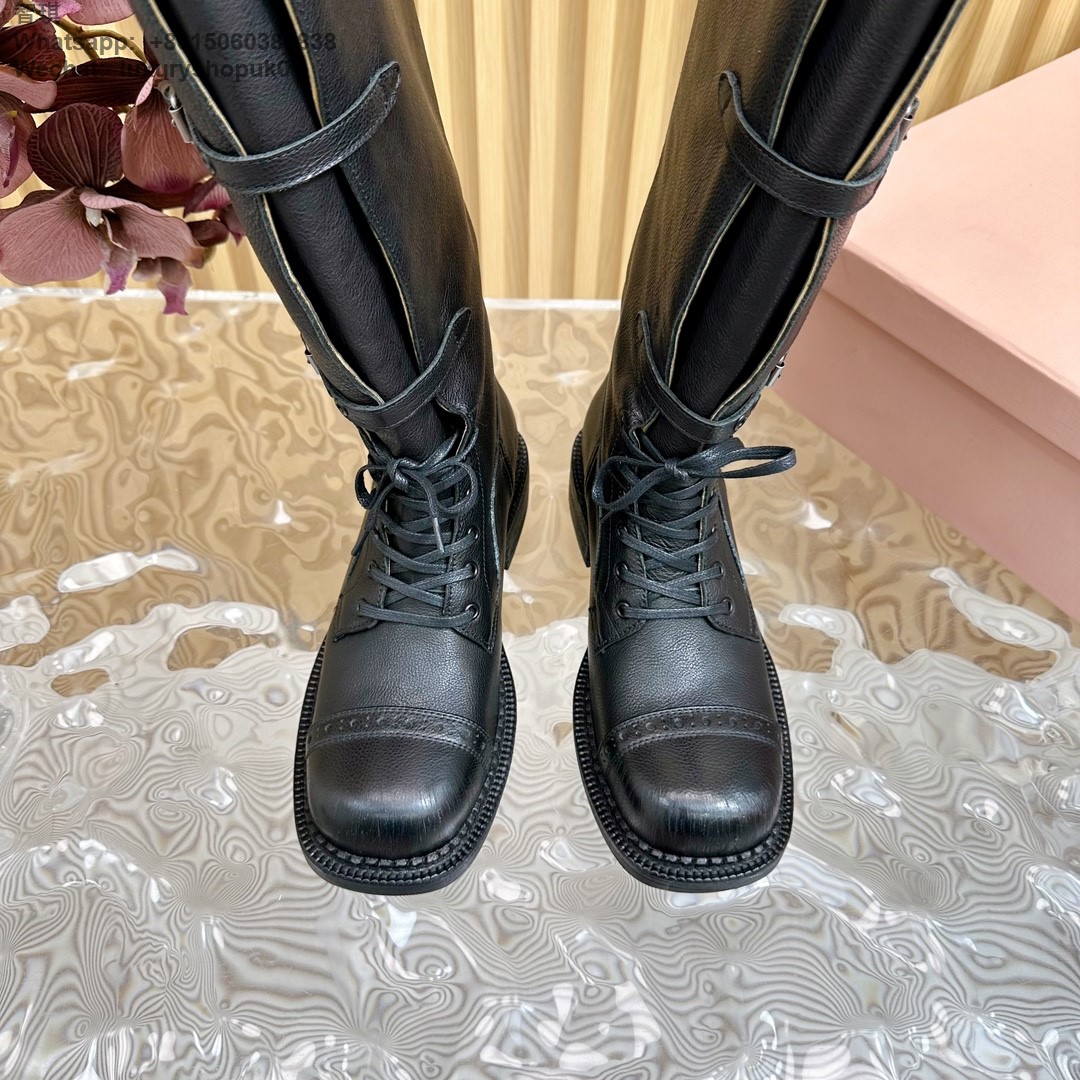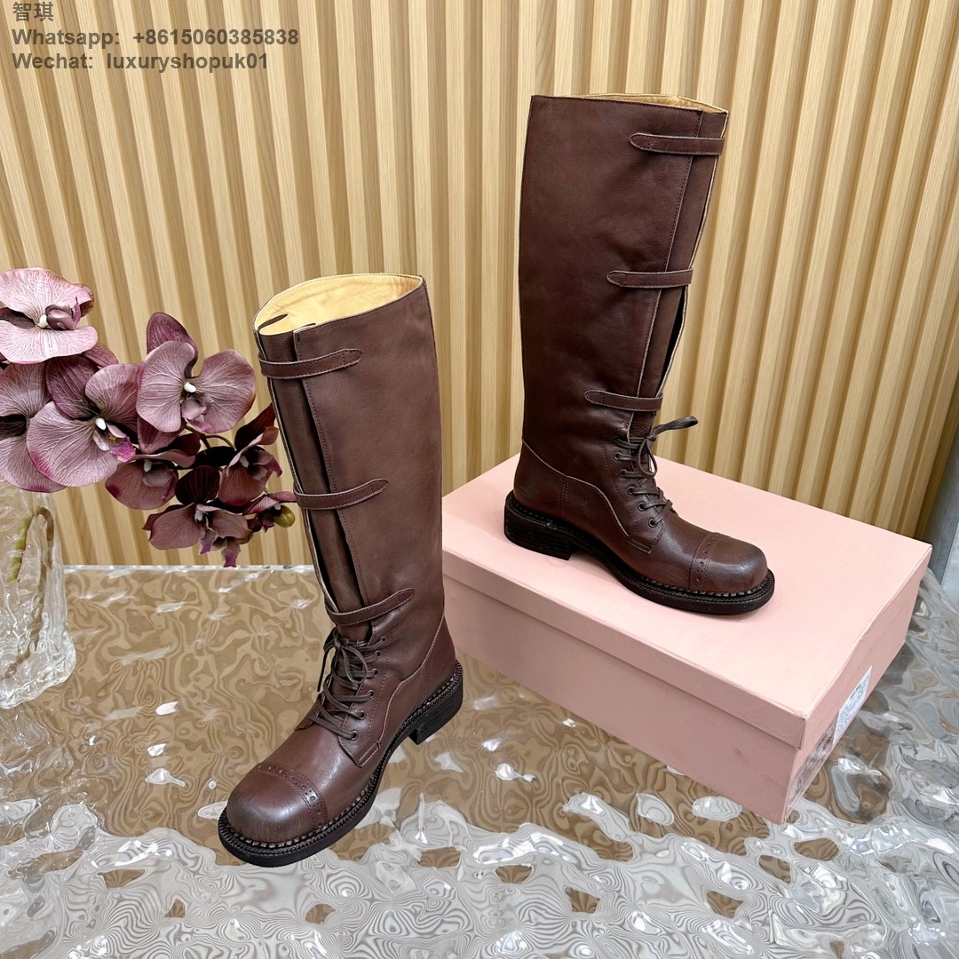 Women Miu Miu Buckled Leather Knee High Biker Boots Shoes