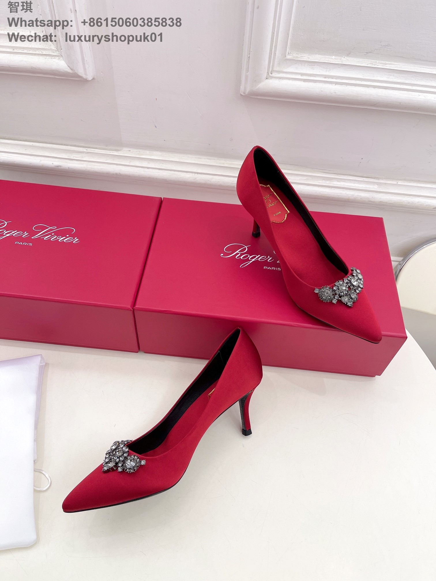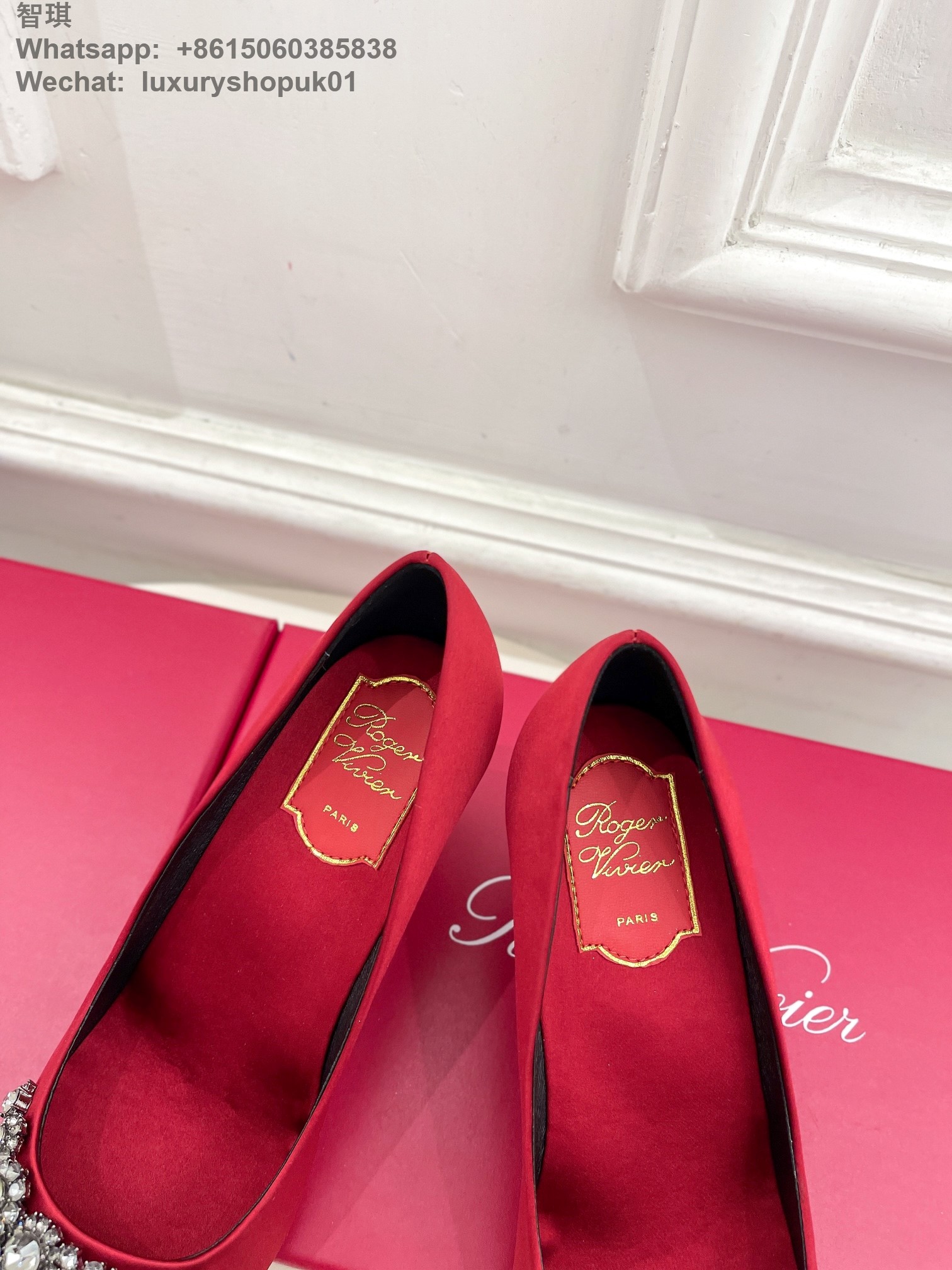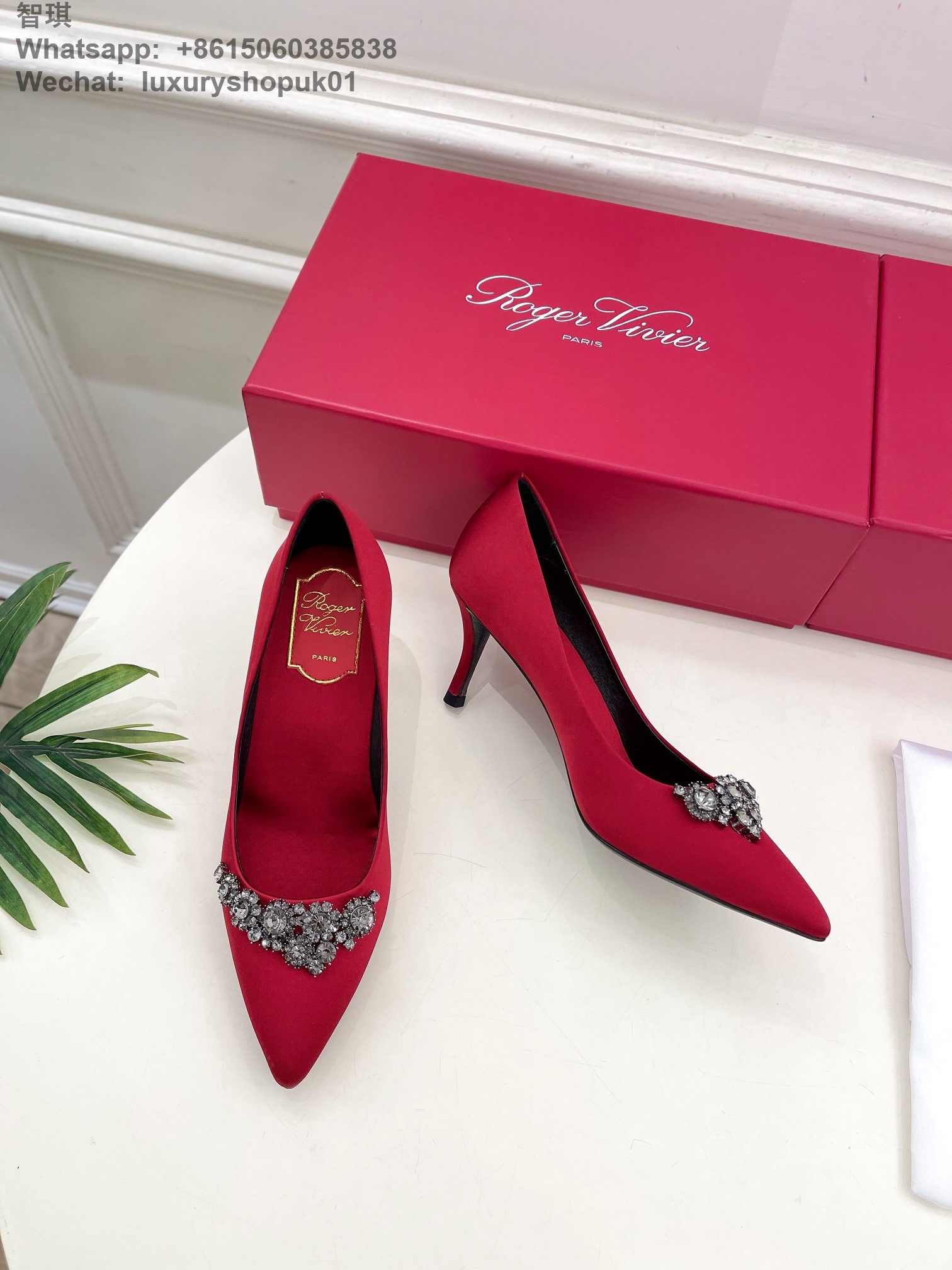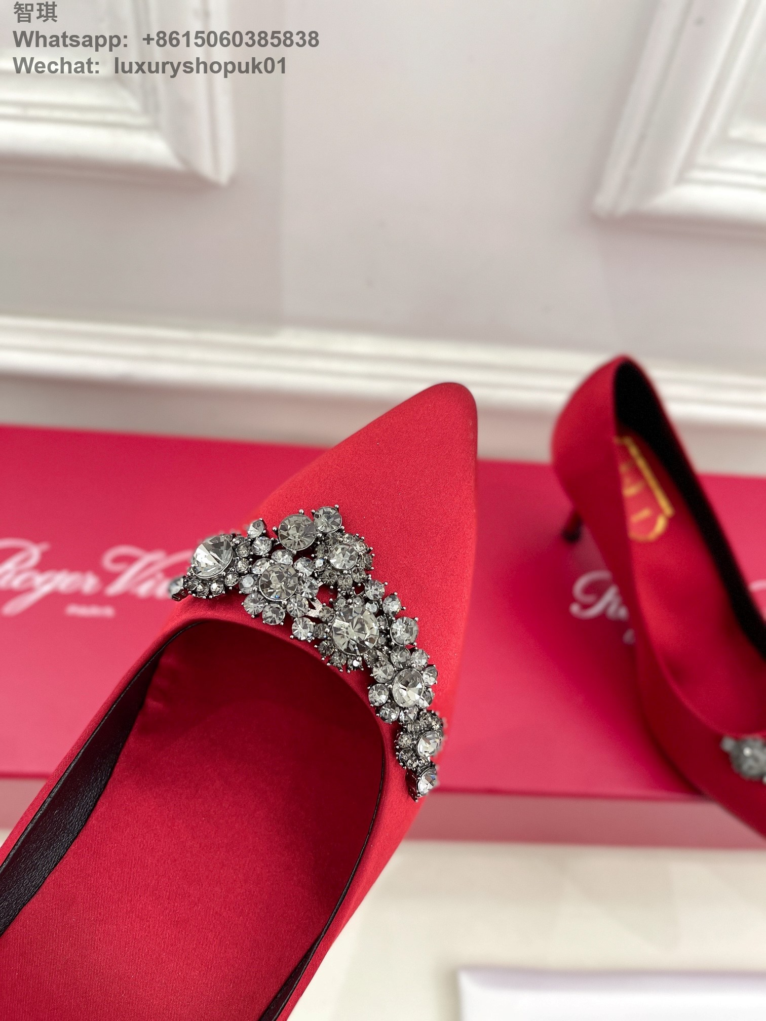 Women Roger Vivier Efflorescence Pumps crystal buckle Satin Silk high heel Shoes 6.5cm red