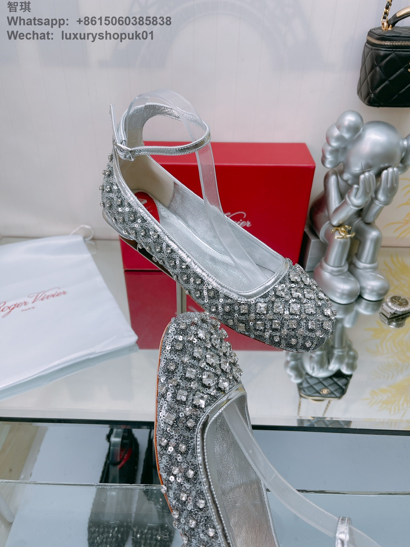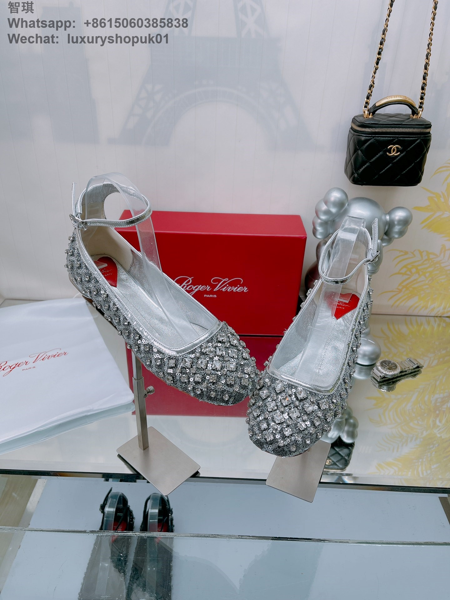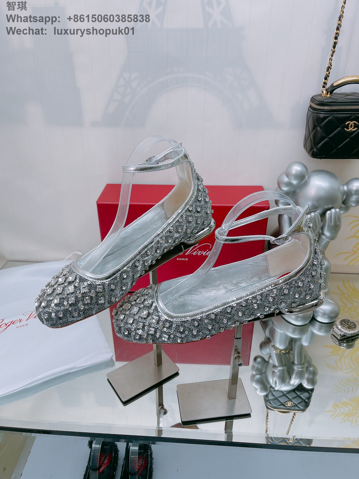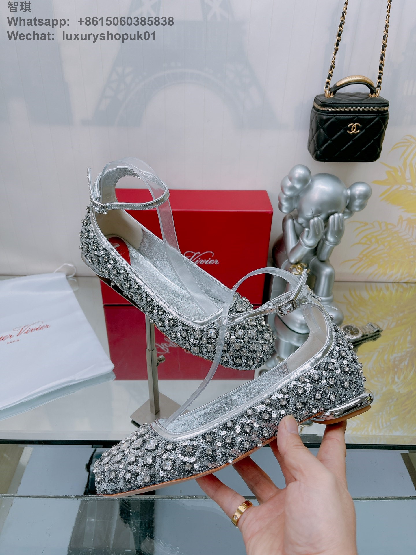 Women Roger Vivier sequin crystal buckle Ankle strap Ballet Flats Shoes